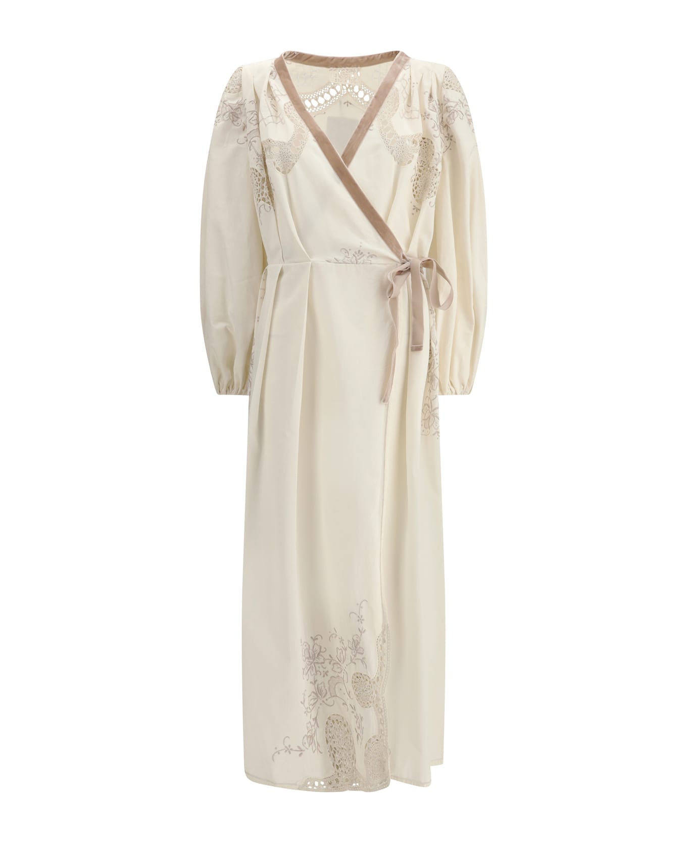 Ella's impero long dress is a garment with timeless appeal, combining elegance and sophistication in a sophisticated design. its crossover front, combined with a closure via a knotted velvet ribbon at the waist, enhances the figure with a sleek silhouette. long puff sleeves add a touch of romance, while sangallo lace inserts lend a delicate contrast of texture. the deep v-neckline and all-over embroidered flowers further embellish the dress, lending an air of femininity and elegance.