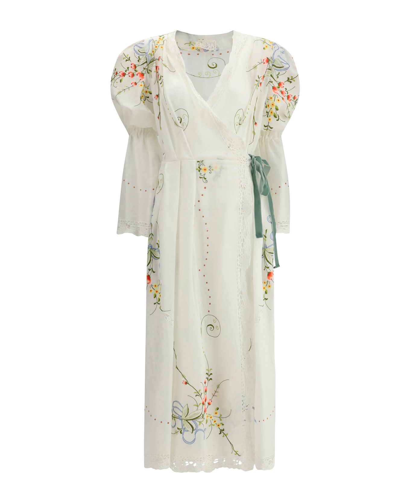 Ella's impero long dress is a garment with timeless appeal, combining elegance and sophistication in a sophisticated design. its crossover front, combined with a closure via a knotted velvet ribbon at the waist, enhances the figure with a sleek silhouette. long puff sleeves add a touch of romance, while sangallo lace inserts lend a delicate contrast of texture. the deep v-neckline and all-over embroidered flowers further embellish the dress, lending an air of femininity and elegance.