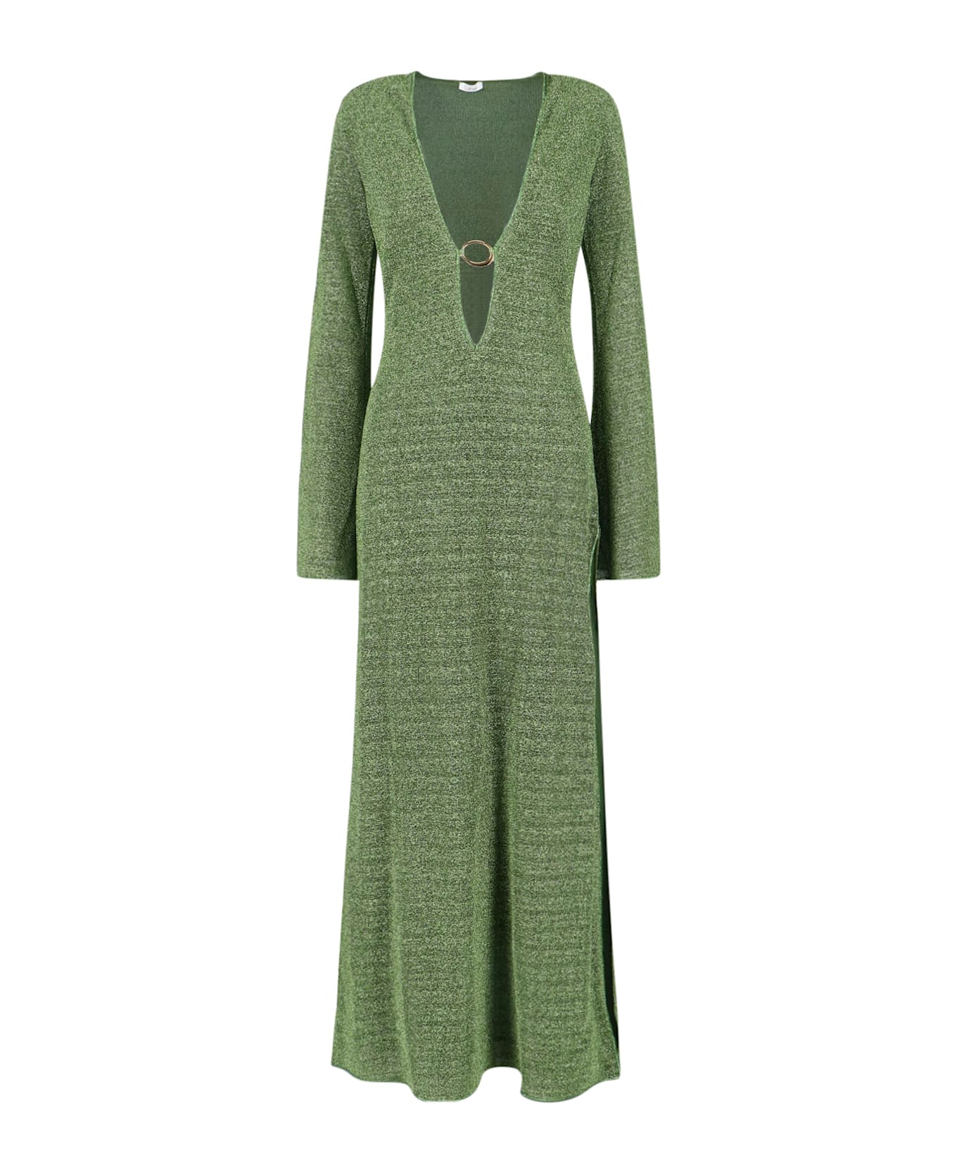- Maxi dress "Kaftan" Oserée in green metallic fabric - deep V-neck - long sleeves - a side slit - gold metal ring detail at the front