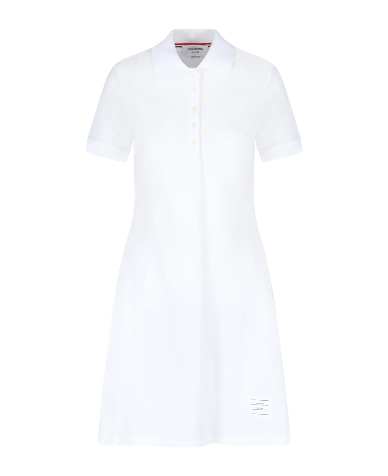 Thom Browne 'Pique Rib Gusset' white cotton minidress with classic collar, button closure, short sleeves, flared skirt, logo embroidery at the front, tricolor grosgrain tab at the back, straight hem.