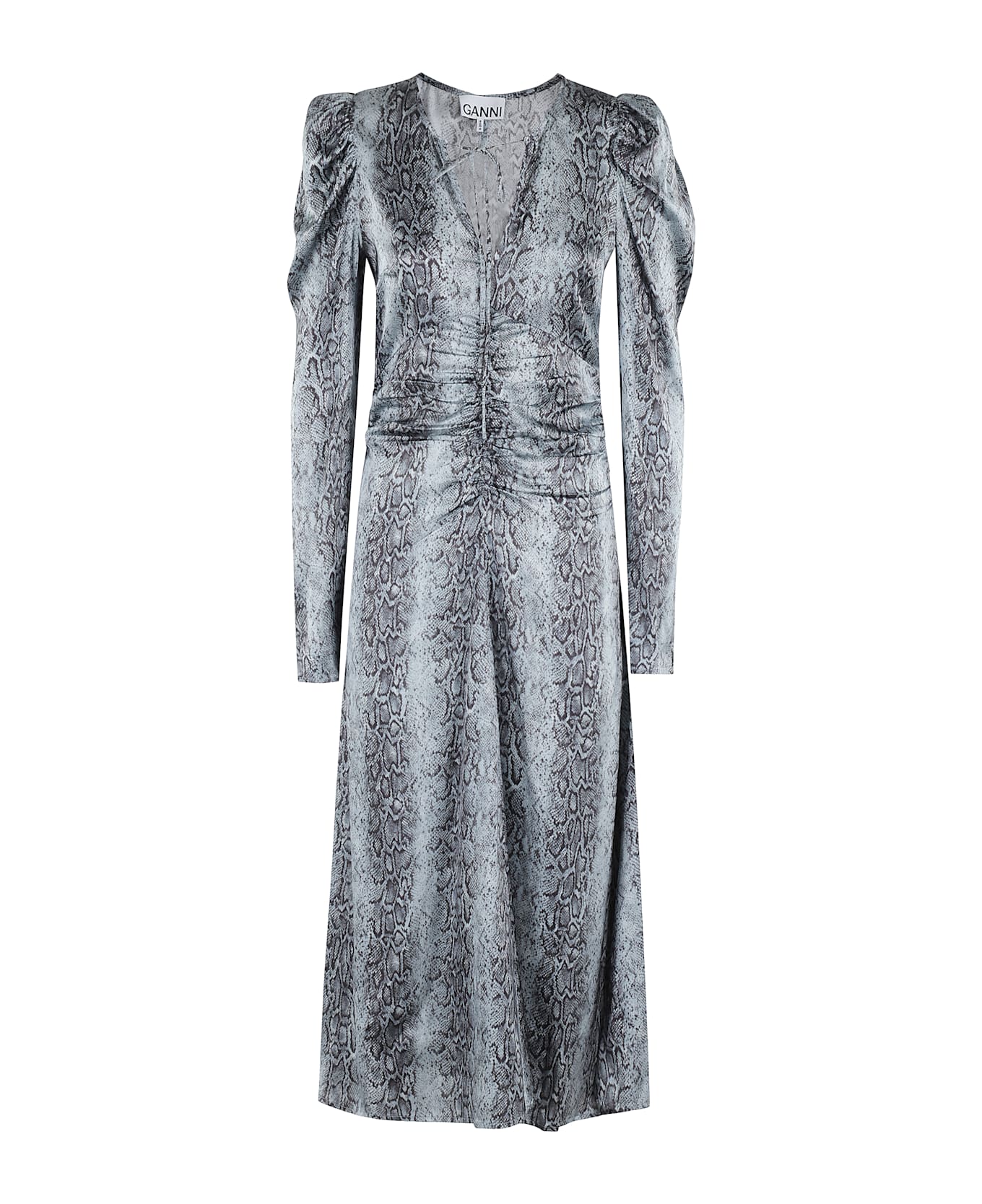 Printed Satin Ruched Satin Dress - Rotate - celestial blue color - python print - drawstring v-neck - long sleeves with ruched straps - ruched waist - soft skirt with ankle length - side zipper - regular fit
