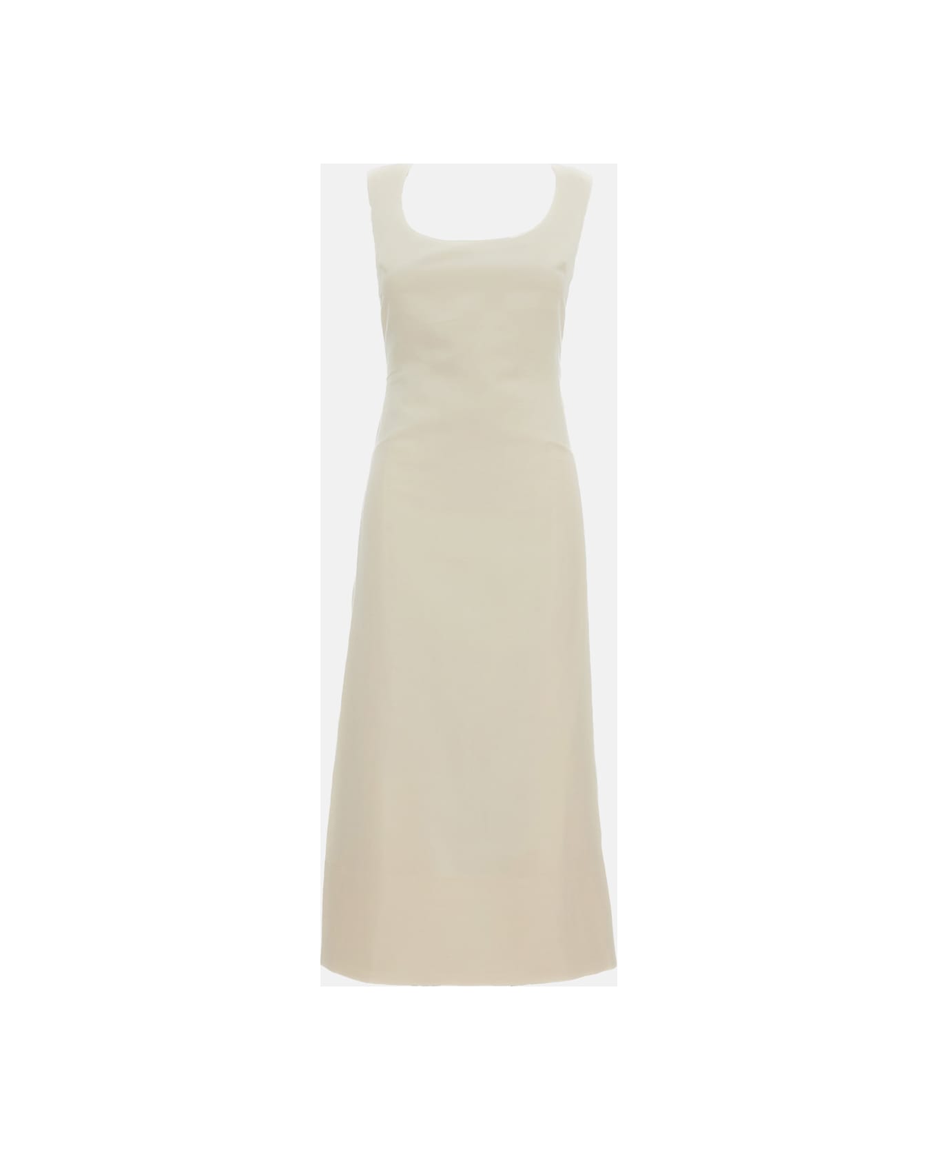 Linen blend dress Fitted fit Lined Side pleats Deep round neckline Squared armholes Invisible back zipper Rear slit Color: white Composition: 82% Linen, 18% Viscose