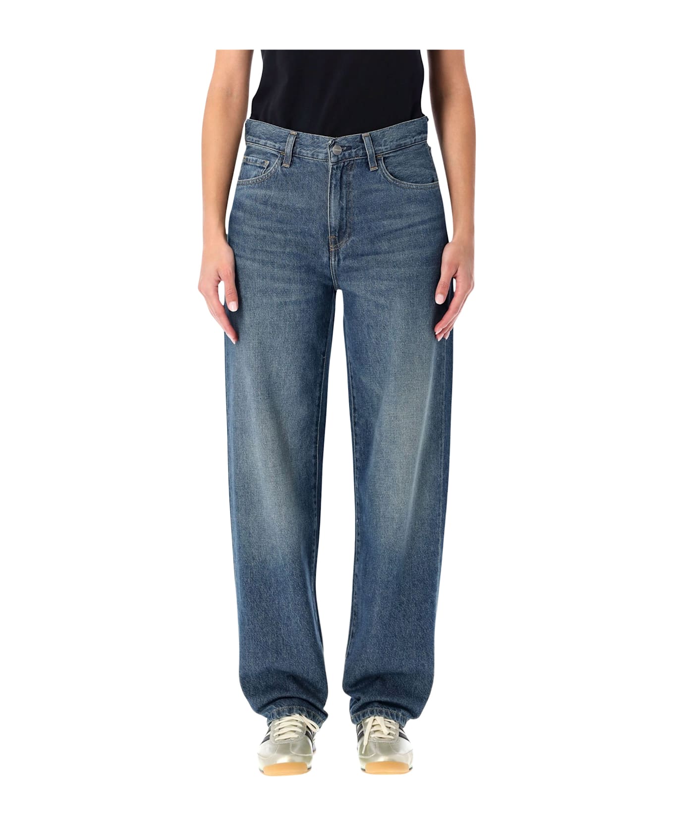 The Carhartt Wip Arin Pants Merge Classic Five-pocket Style With The Brand s Signature Durability. Crafted From Organic Fairfield Cotton Denim, They Feature A Tapered Fit With A Regular Waist, Reinforced With Bartack Stitching And Rivets At Key Stress Points. A Timeless Piece Offering Everyday Comfort, Strength, And Authentic Workwear Appeal. 100% Organic Fairfield Cotton Denim Tapered Fit, Regular Waist Five-pocket Construction With Back Yoke Reinforced Bartack Stitching And Rivets Button And Zip Fly Closure Woven Square Label On Back Pocket Alessandra Is 1,75 M And Wears Size 26