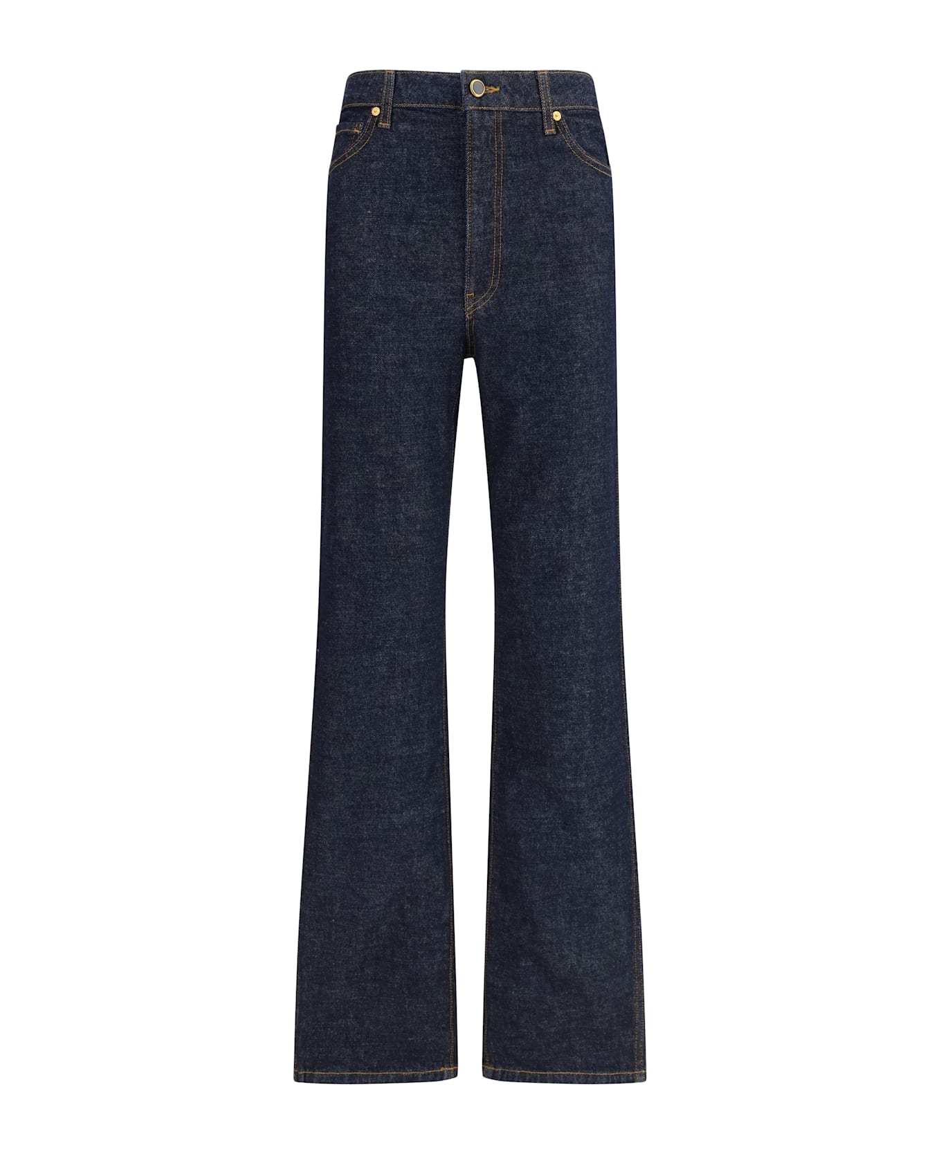 The danielle jeans by khaite in benson color are crafted from hand-finished denim with a rich dark wash and an inside-out rinse, giving them character and a vintage quality enhanced by ozone softening. designed with a high-rise fit to visually elongate the legs, the stovepipe silhouette flatters the figure. finished with marigold topstitching and an enameled button, this piece showcases refined, handcrafted details.