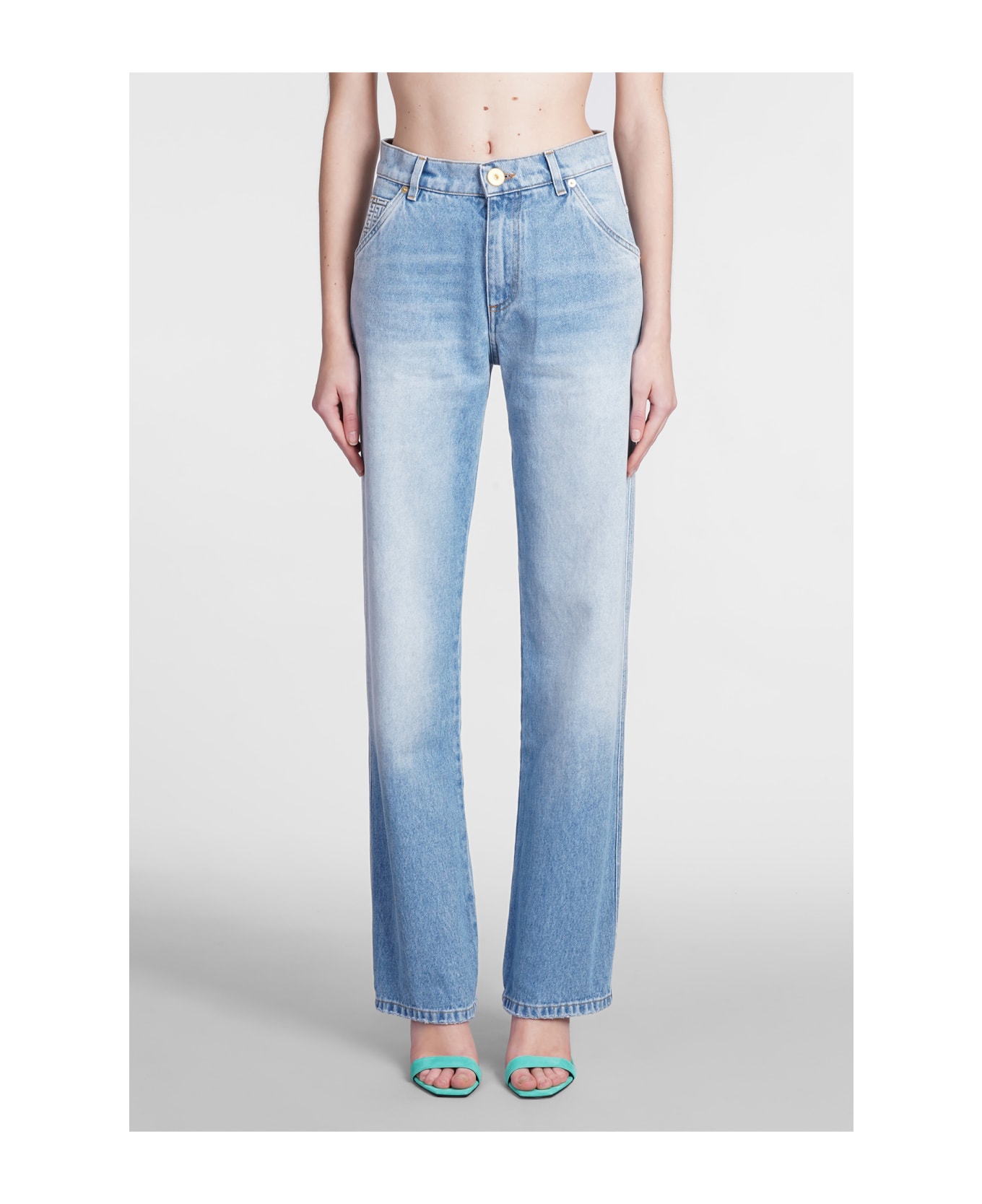 Jeans in blue denim, button and zip closure, five pockets, waist belt loops, flared, monogram print, 100% cotton, Model is 180 cm and wears 38