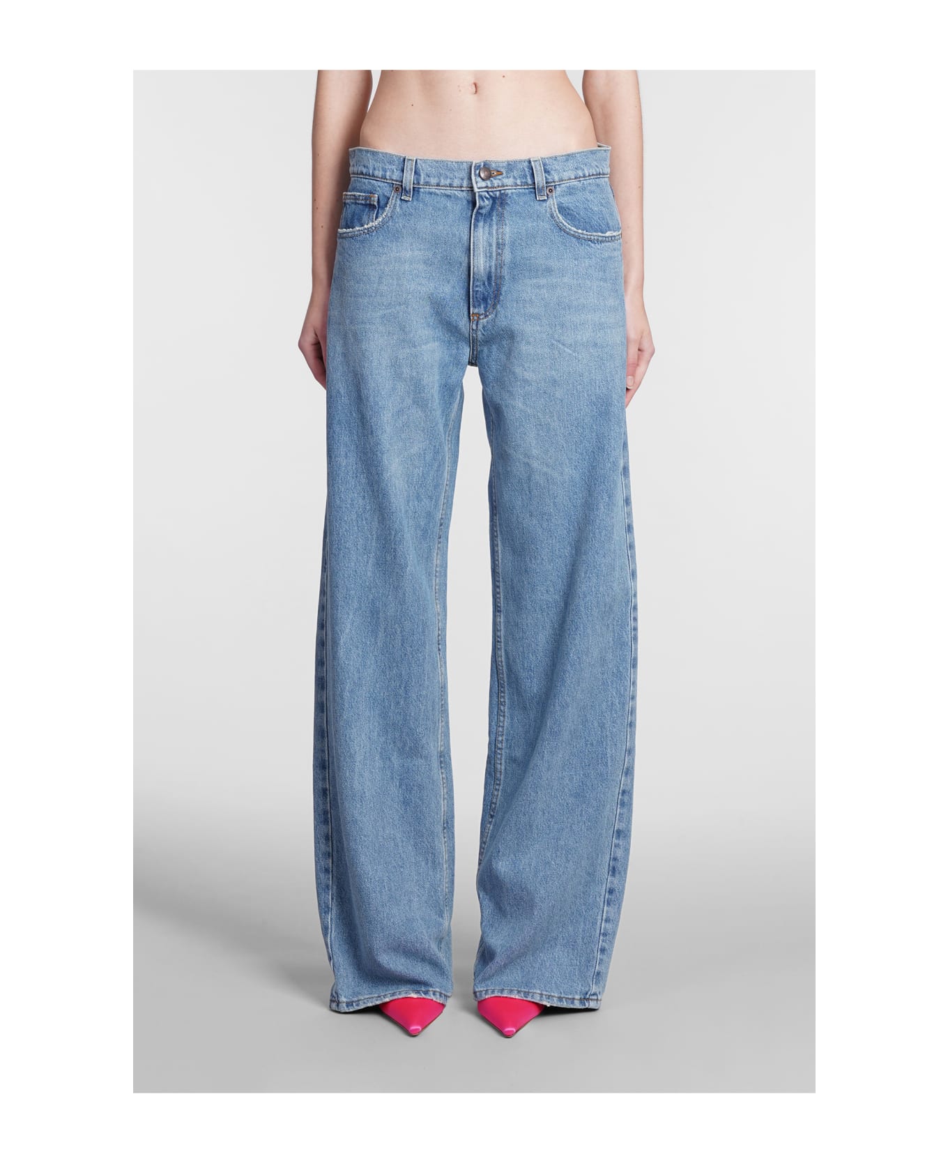 Jeans in cyan denim, button and zip closure, five pockets, waist belt loops, 100% cotton, Made in Poland, Model is 180 cm and wears 36
