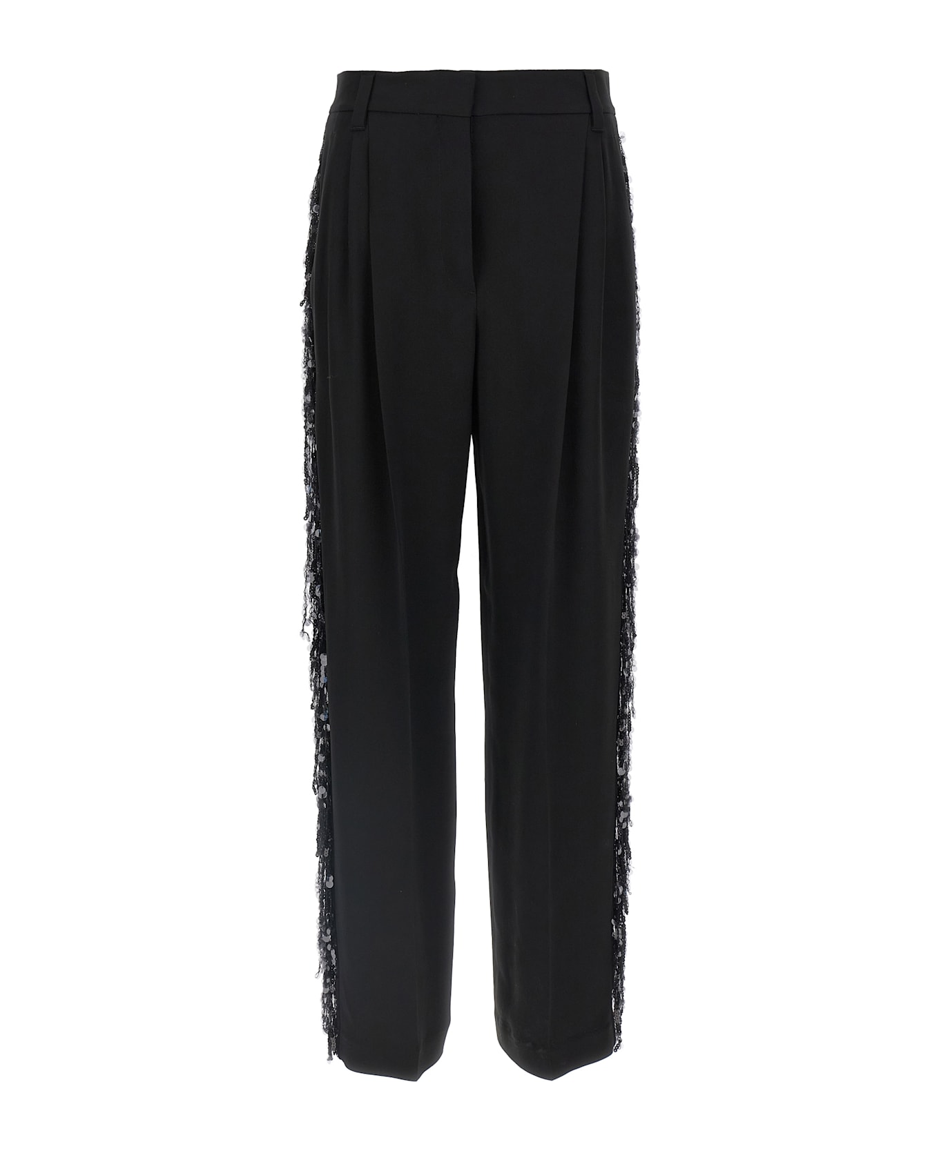 'Relaxed Tailored' pants in crepe cady silk and acetate, 'Glistening Waterfall Embroidery' fringe and sequin detail on the side, double pleats, stretched pleat, pockets, zip hook and front button closure, wide leg.