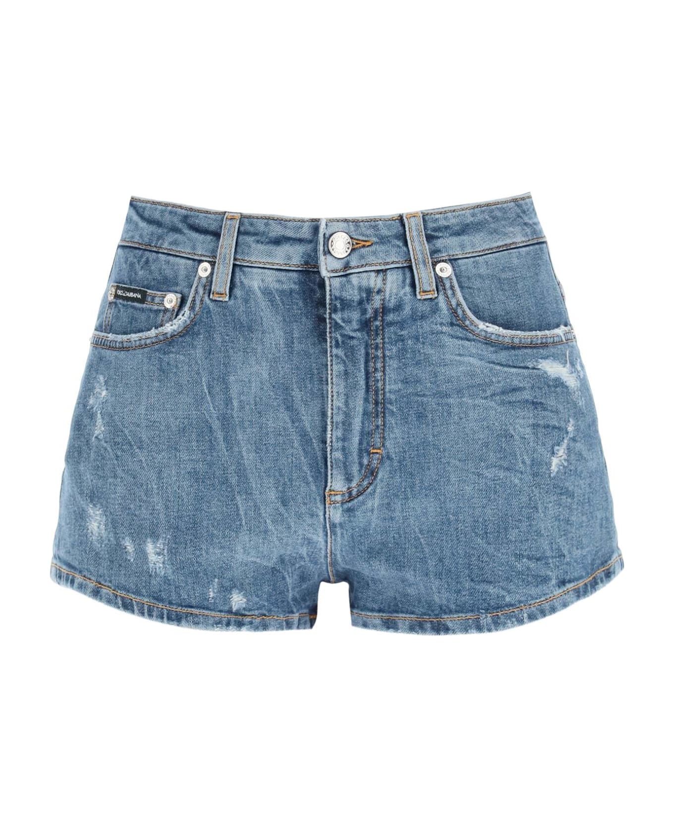 Dolce & Gabbana five-pocket shorts in stretch denim, finished with distressed detailing and contrast stitching. High-waisted style with belt loops, zip fly with top button, logo label on the front pocket, and metal logo tag on the back pocket. The model is 177 cm tall and wears a size IT 40.