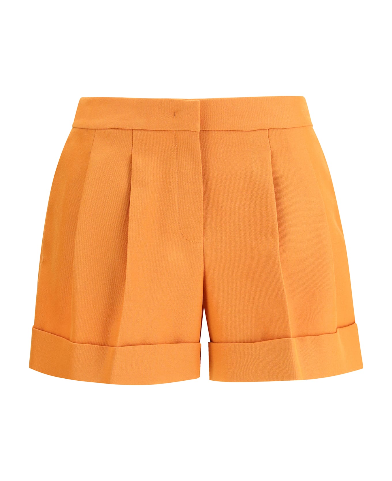 The grain de poudre wool shorts by fendi feature a flared silhouette enhanced by double front pleats that give structure and refinement. side pockets and a turned-up hem lend a modern and effortless elegance. the concealed zip and hook closure ensures a clean look, while the tonal fendi embroidered lettering on the left side adds a subtle signature touch. crafted from orange grain de poudre wool, they combine tailored style with strong personality. Composition: 100% % Fleece Wool