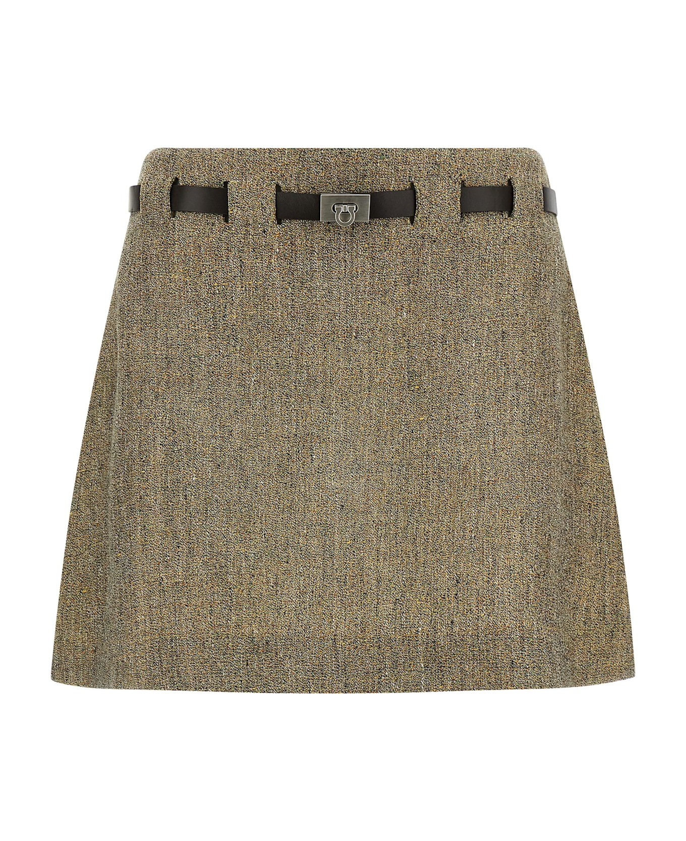Mini skirt in spun linen with a grained texture, slightly flared silhouette, model with back pleats, side zip closure, buttonholes with leather belt with metal 'Gancini' buckle inserted. Composition: 100% linen