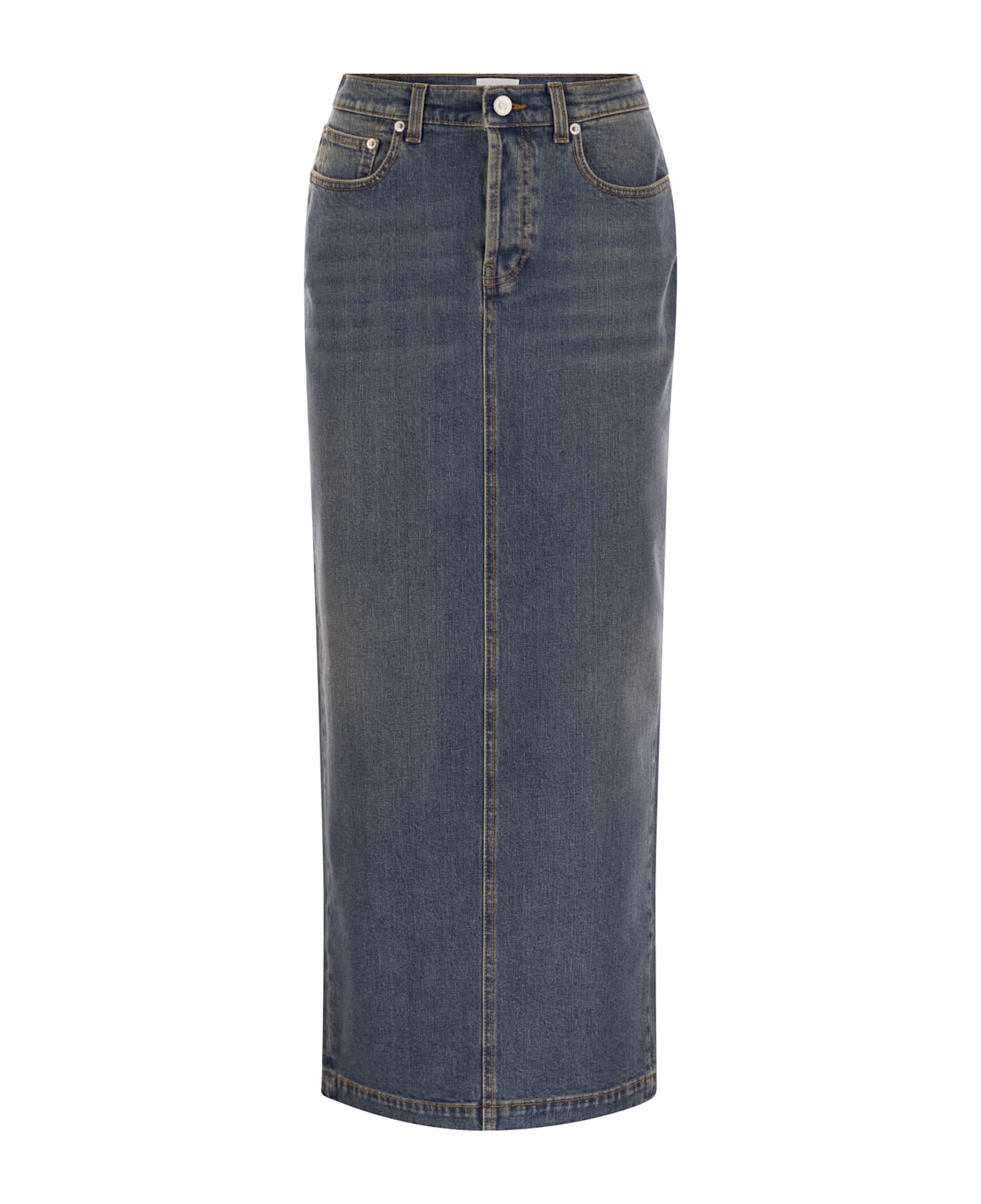 The long denim skirt combines the versatility of the fabric with a contemporary look. Featuring a slit at the back, five pockets and a slightly vintage effect. - Back slit - 5 pockets - Length above the ankle DESIGNER ID: GND265F345L182 VR1 Composition: 99% Cotton, 1% Elastane