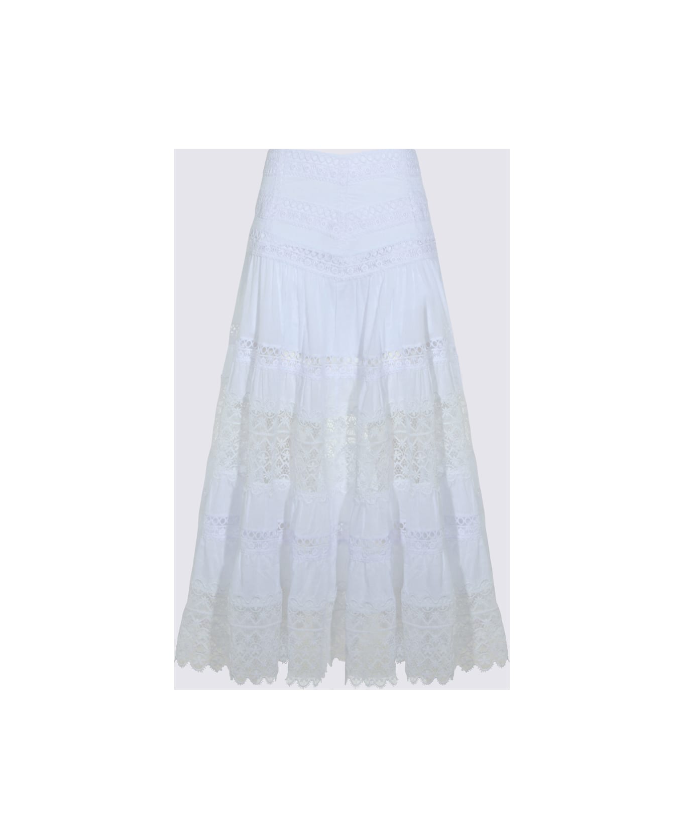 White cotton skirt from Charo Ruiz Ibiza featuring elasticated high waist, trasparence, lace details and midi lenght.