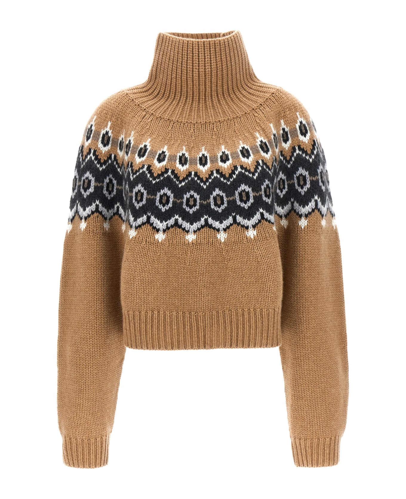 'Amaris' cachemire sweater with contrast intarsia, slightly boxy crop style with high neck. Composition: 93% ws 4% po 3% wm
