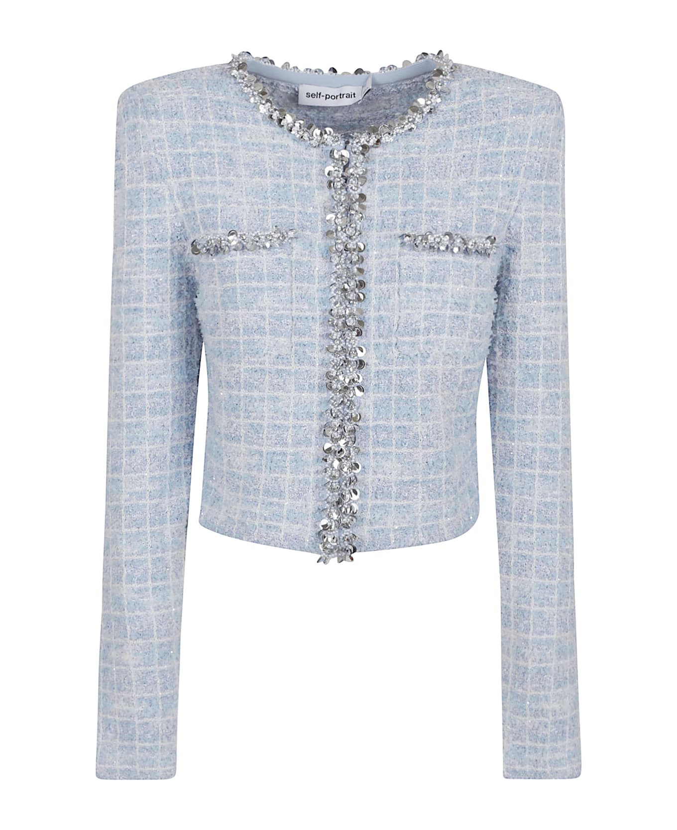 Knit jacket by SELF-PORTRAIT. Front button closure; Functional pockets; Removable shoulder pads; Regular fit design, Stretch fabric, Cropped cut. Features sparkling sequin trims.