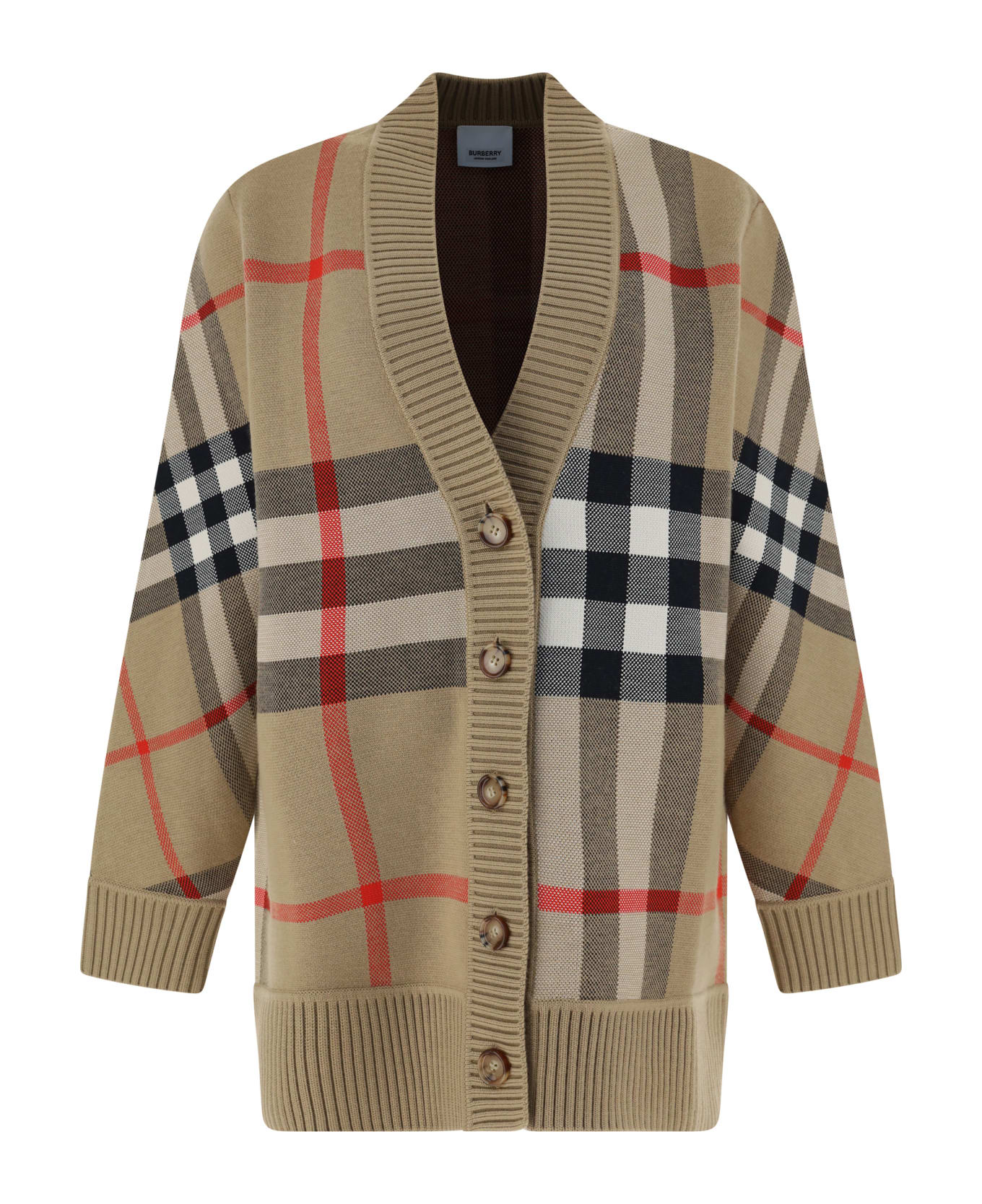 Caragh sweater by burberry, buttons closure, plunging v neckline, ribbed edges, iconic print all over. Composition: 51% % Polyester, 49% % Wool