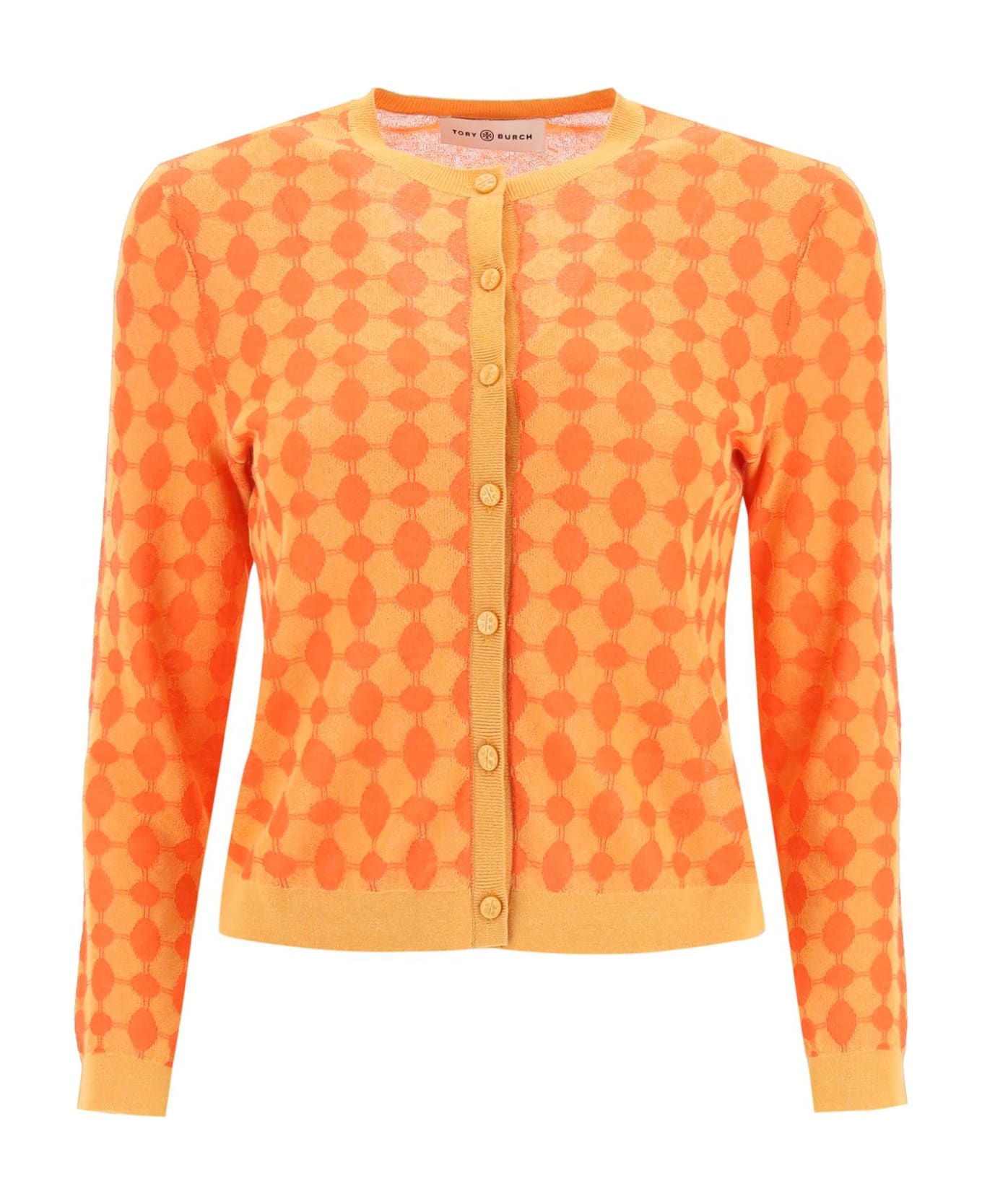 Tory Burch crewneck cardigan in patterned cotton blend jacquard knit. Embossed button closure, ribbed edges, regular fit. The model is 177 cm tall and wears a size S.