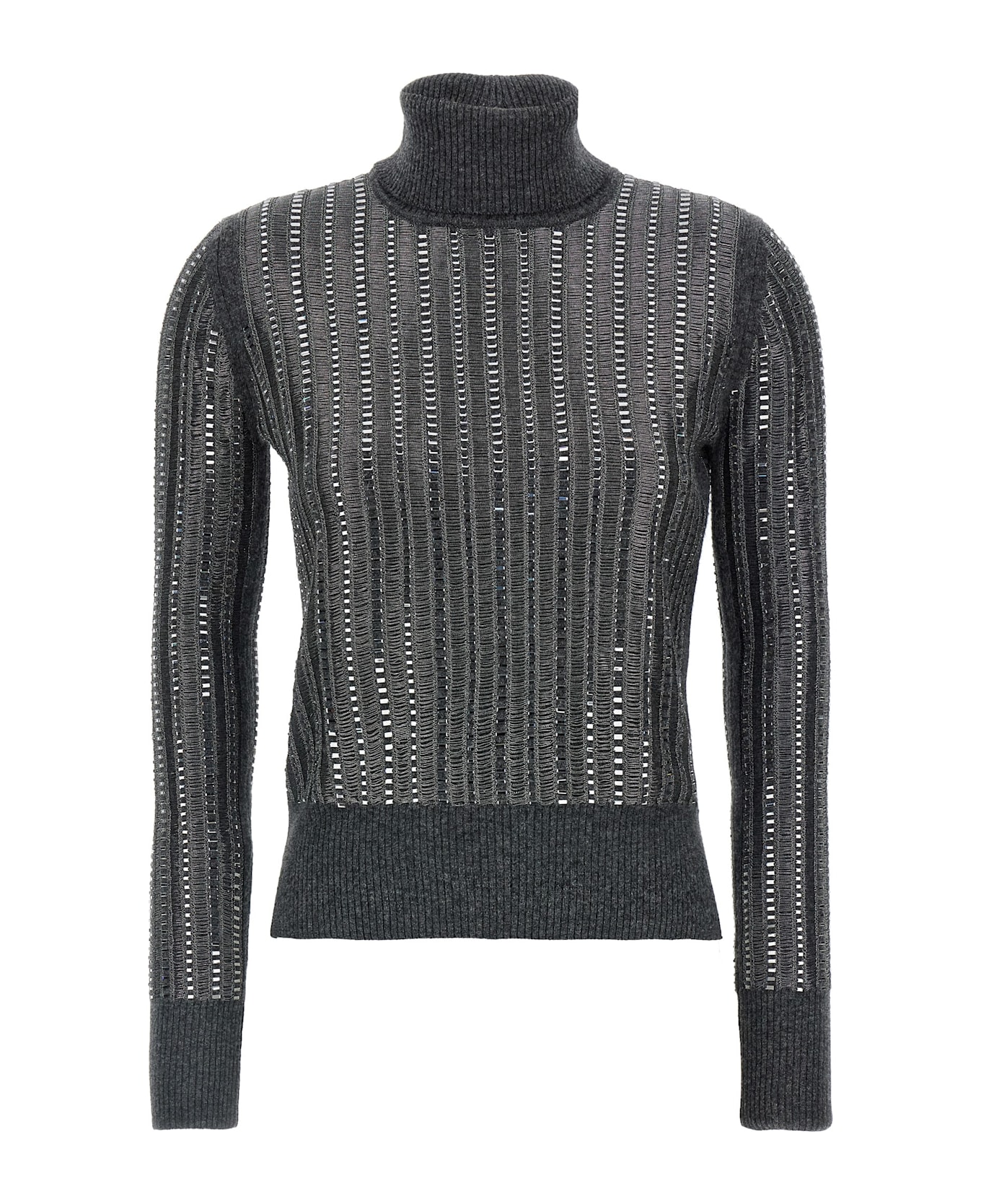 Wool and cashmere blend sweater with lurex thread and all-over crystal appliqué, high neck, long cuffed sleeves, side slits. Composition: 55% wv, 24% ws, 18% vi, 3% me