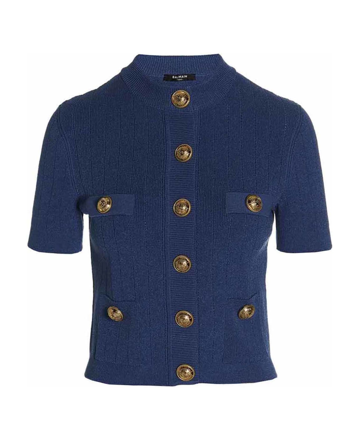 Ribbed knit cardigan with front logo buttons, crewneck, short sleeves and a cropped style. Composition: 83% viscose 17% polyester
