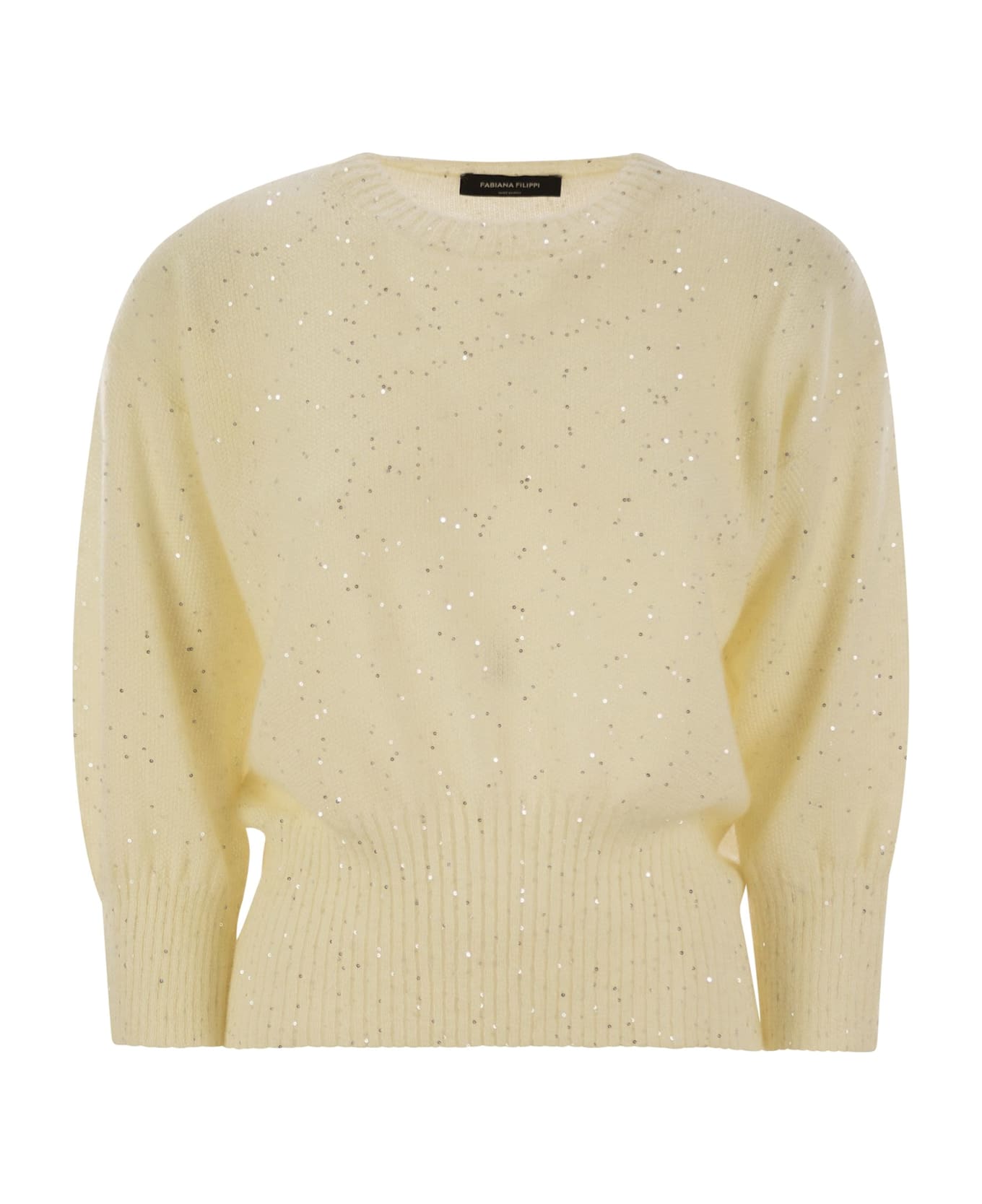 This bright regular-fit ¾-sleeve sweater is made of a fine mohair yarn with micro rice-grain stitch sequins. Produced entirely in Italy using sustainable processes. - Mohair with micro sequins - Crew neck - Ribbed edges DESIGNER ID: MAD265F040D817 0150 Composition: 67% Polyamide, 33% Mohair