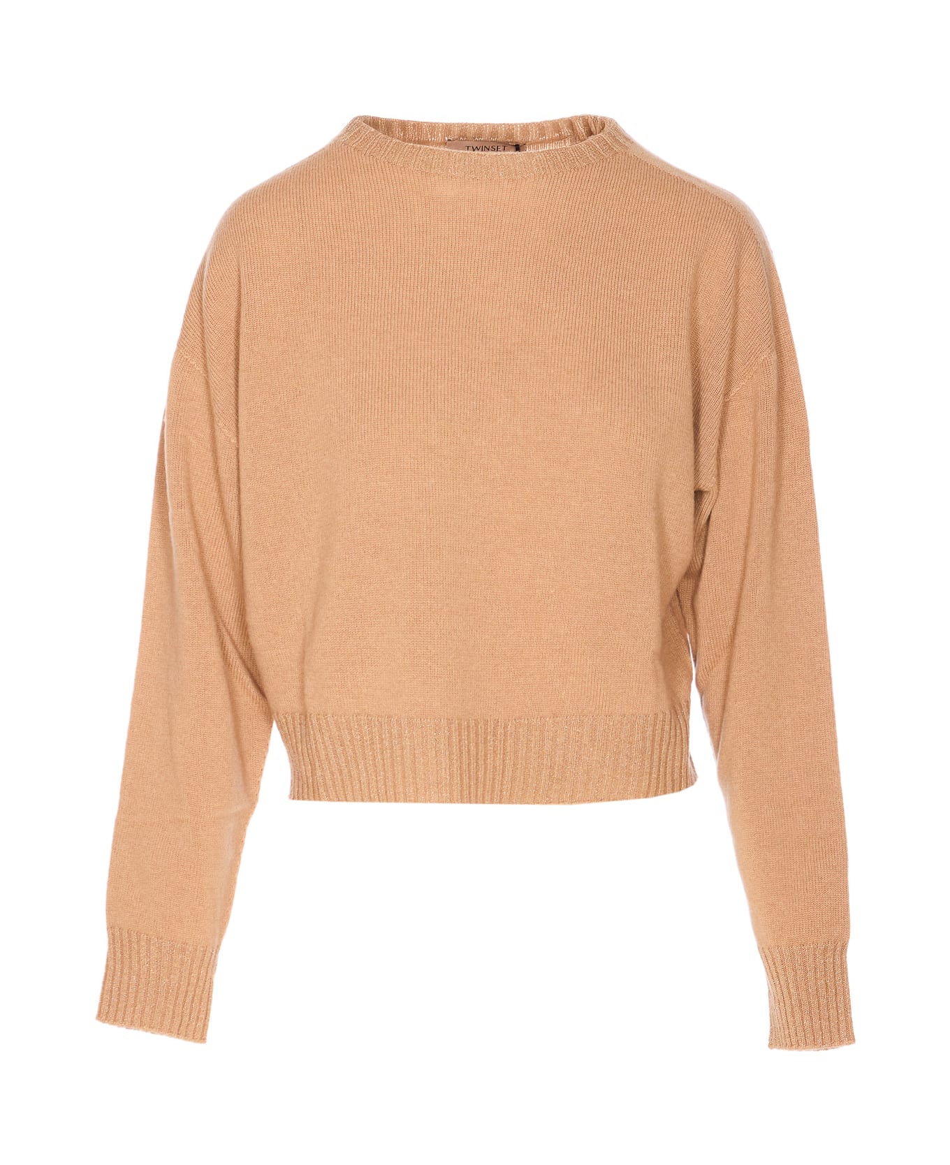 Twinset beige sweater, back logo, crewneck, golden glitter effect on profiles Composition: 84% Wool, 12% Cashmere, 4% Polyester