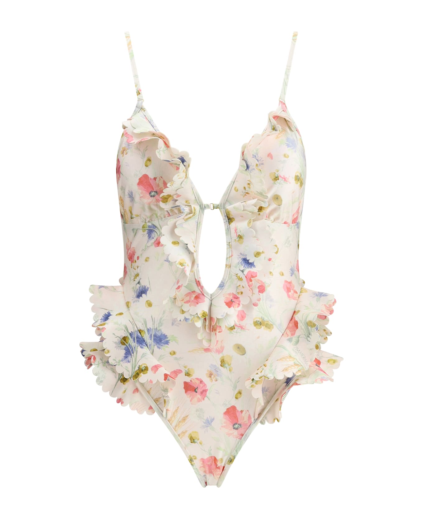 Zimmermann's lucky waterfall swimsuit features a multicolored floral pattern throughout. featuring a v-neckline and ruffle details decorating the garment, it has thin, adjustable straps, a tie-back closure, and an exposed back for an elegant and sensual look. lined for added comfort, it is perfect for a refined summer look.