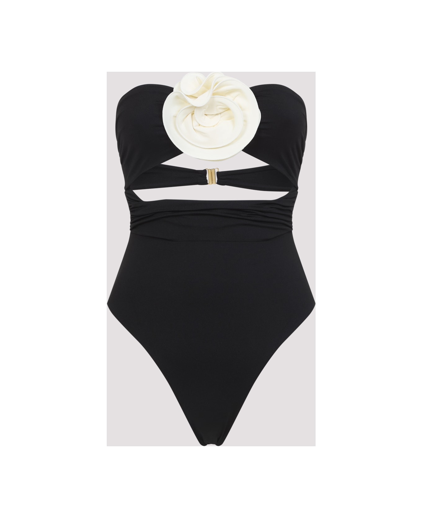 La Reveche Black Hegra One Piece Swimwear. Crafted in polyamide and elastane blend. Strapless swimwear, sweetheart design, front contrasting ivory white 3D embellishment flower detail, front cut-out detail, back buckle fastening, side crinkle effect, tonal stitching.