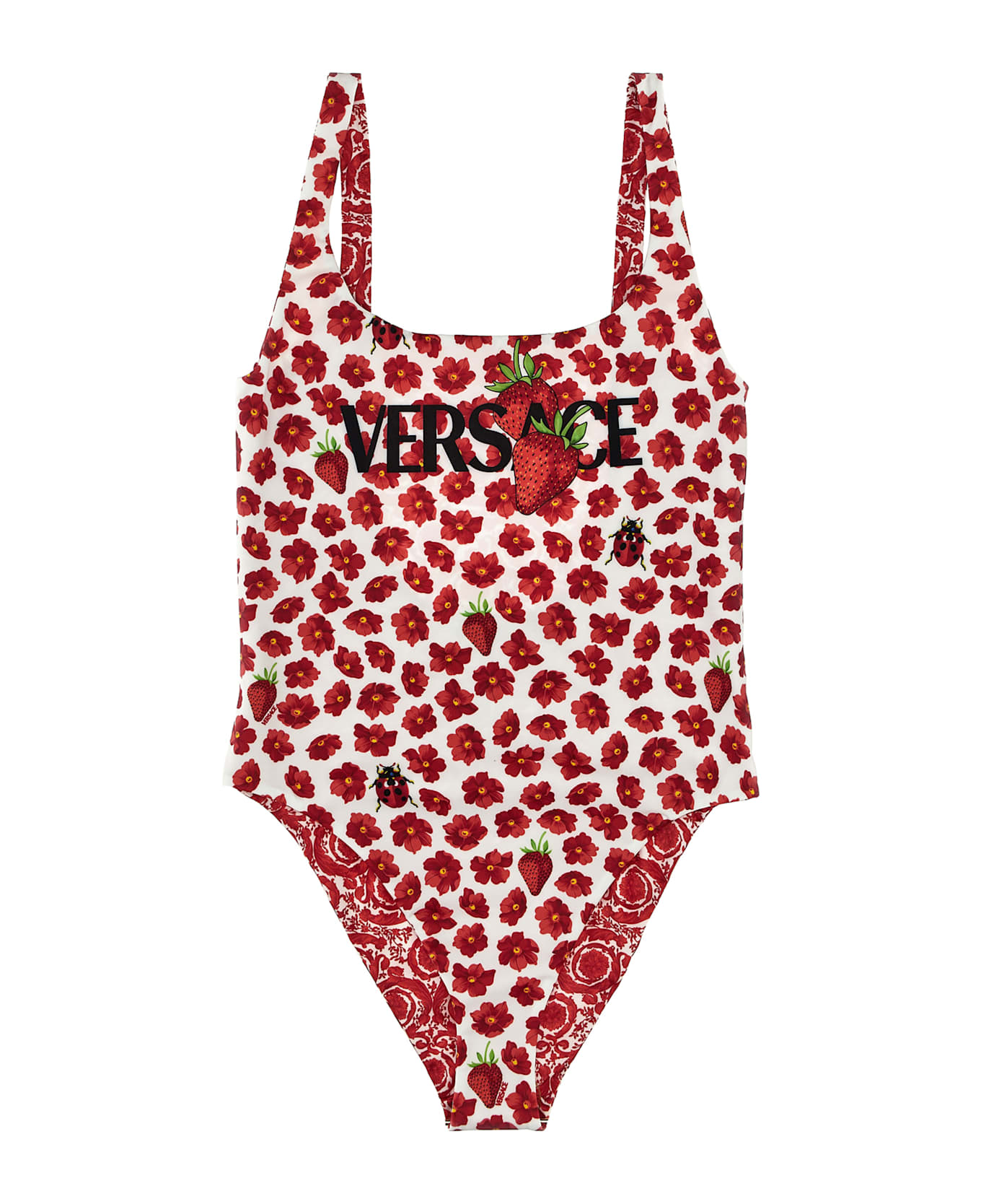 Reversible stretch fabric swimsuit with all-over 'Strawberry Garden' print, central Versace logo, Baroque print, thin straps, square front neckline, and deep back neckline. Composition: 78% polyester, 22% elastane