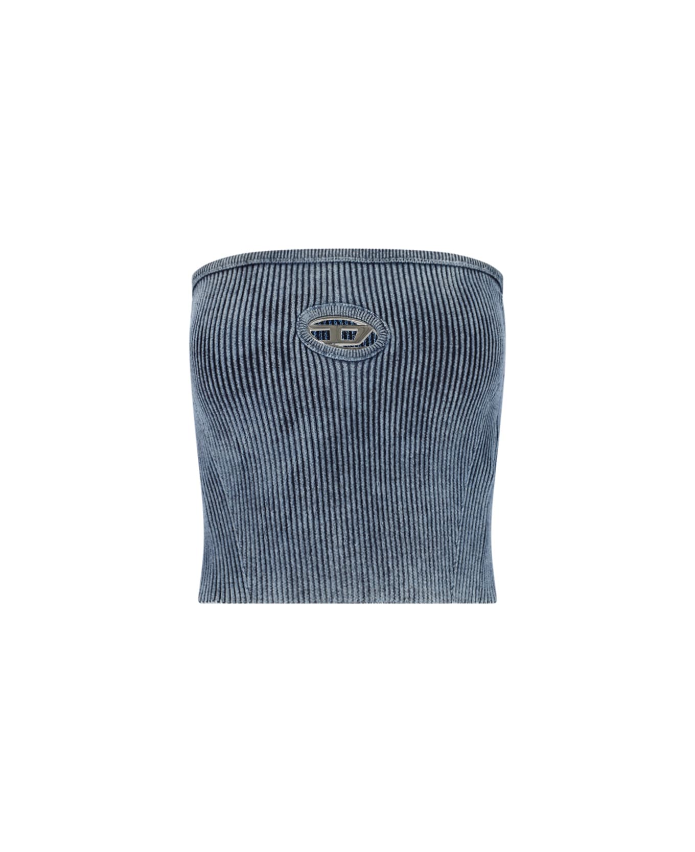Diesel 'M-Clarksvillex-C' crop top in blue stretch cotton blend with distressed wash, ribbed pattern, straight neckline, sleeveless, Oval D logo in silver metal inlaid at the front, cut-out detail, straight hem. Composition: 84% Cotton, 14% Polyamide, 2% Elastane