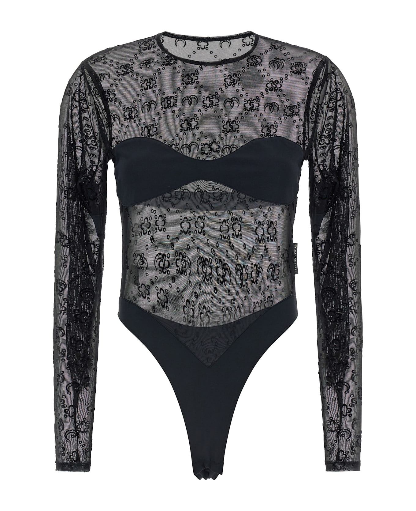 Semi-transparent mesh bodysuit with opaque details and all-over tone-on-tone flocked 'Moonogram' logo, crew neck, long sleeves, wide leg width, snap buttons on the hem. Composition: 86% polyamide, 14% elastane