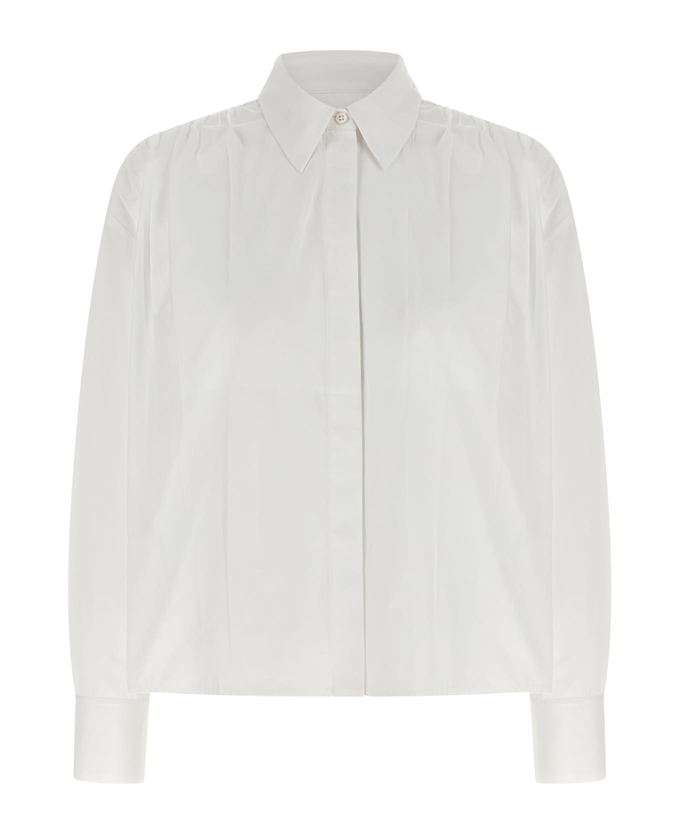 '136' shirt in double cotton poplin with ruffled shoulders with front and back pliers, slightly crop style, concealed front button closure, long cuffed sleeves. Composition: 100% cotton