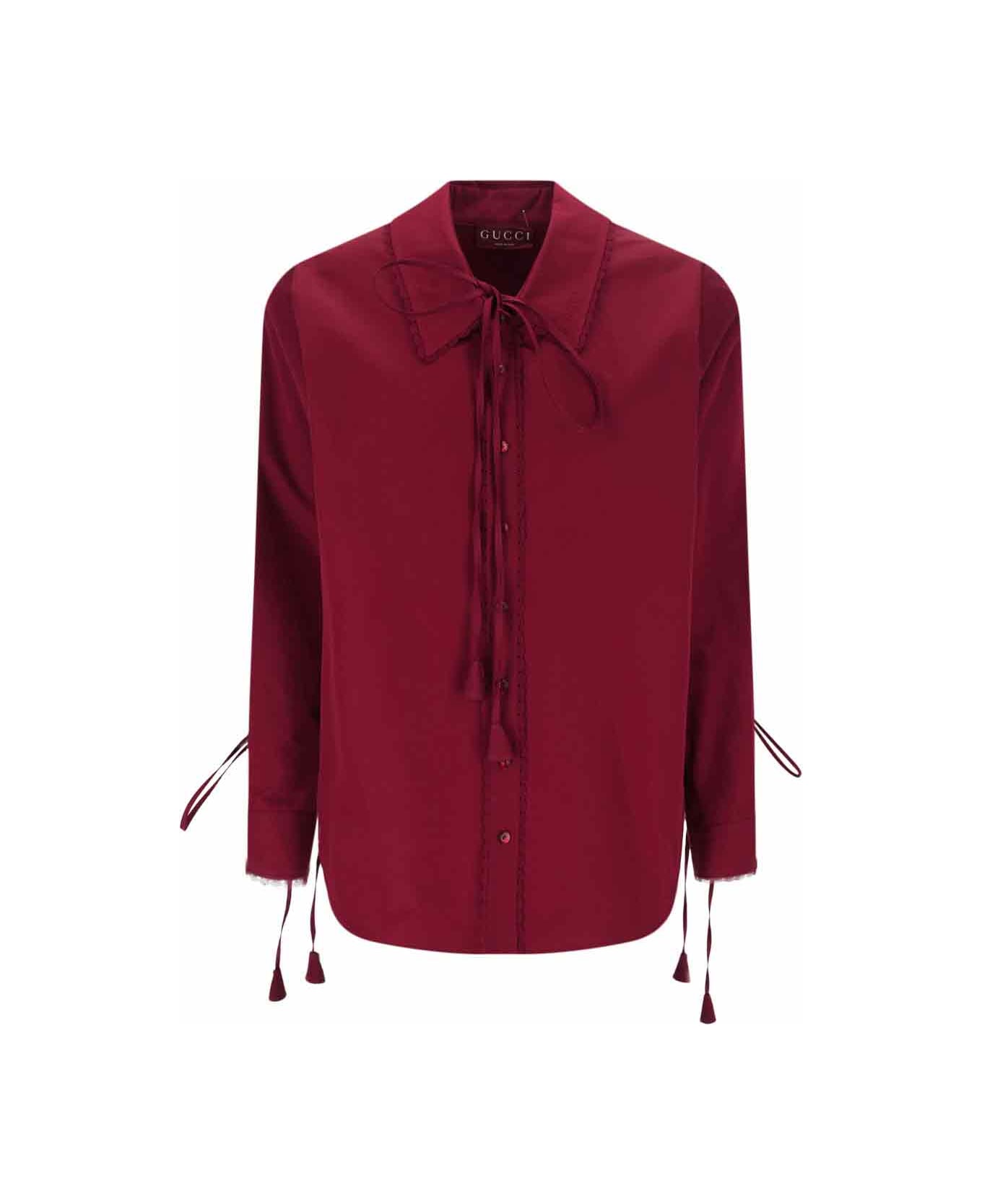 Gucci red cotton shirt with lace trim, classic collar with Embossed logo, adjustable lace detail, button closure, button cuffs, adjustable and removable lace detail, straight hem.