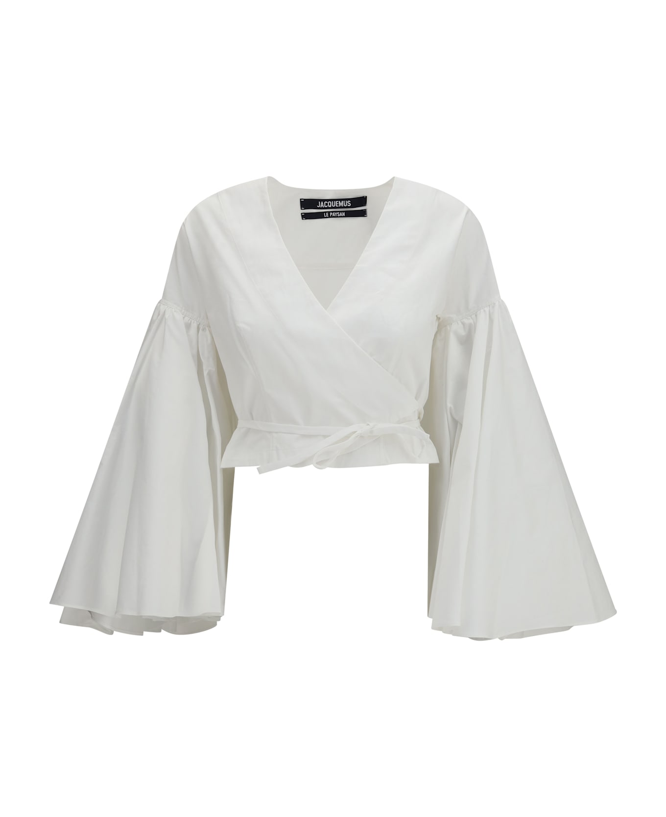 The paysan wrap top by jacquemus is crafted in compact cotton poplin and features a fitted silhouette with a slightly cropped cut that enhances the bust line. the wrap front with adjustable ties at the waist defines the structure of the garment, while the v-neckline adds a feminine touch to the design. the long flared fan-shaped sleeves with godet inserts and dropped shoulders add movement and volume, while the curved back yoke completes the design with a distinctive tailored detail. Composition: 100% % Cotton