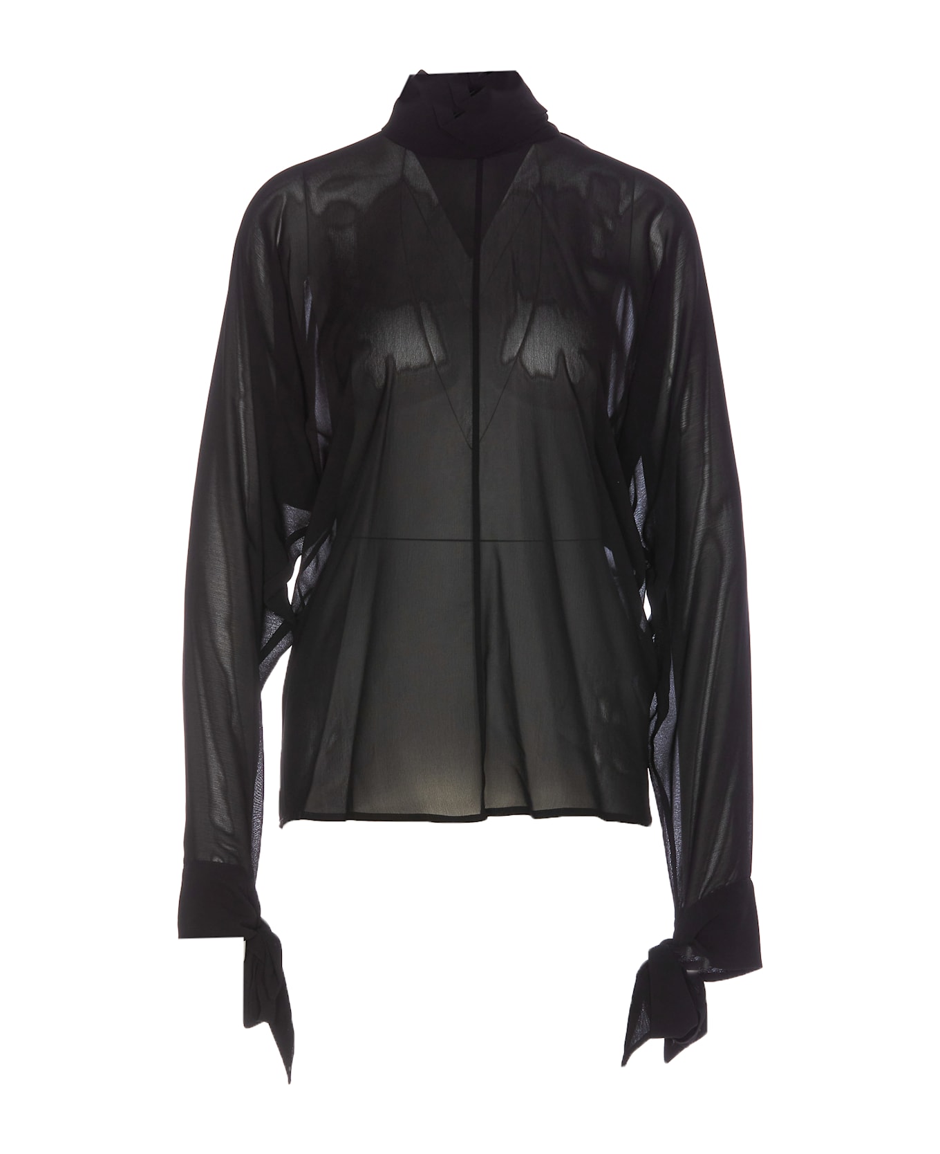Dondup black shirt, high neck with buttons closure on the back, long sleeves, bow detail, transparent effect