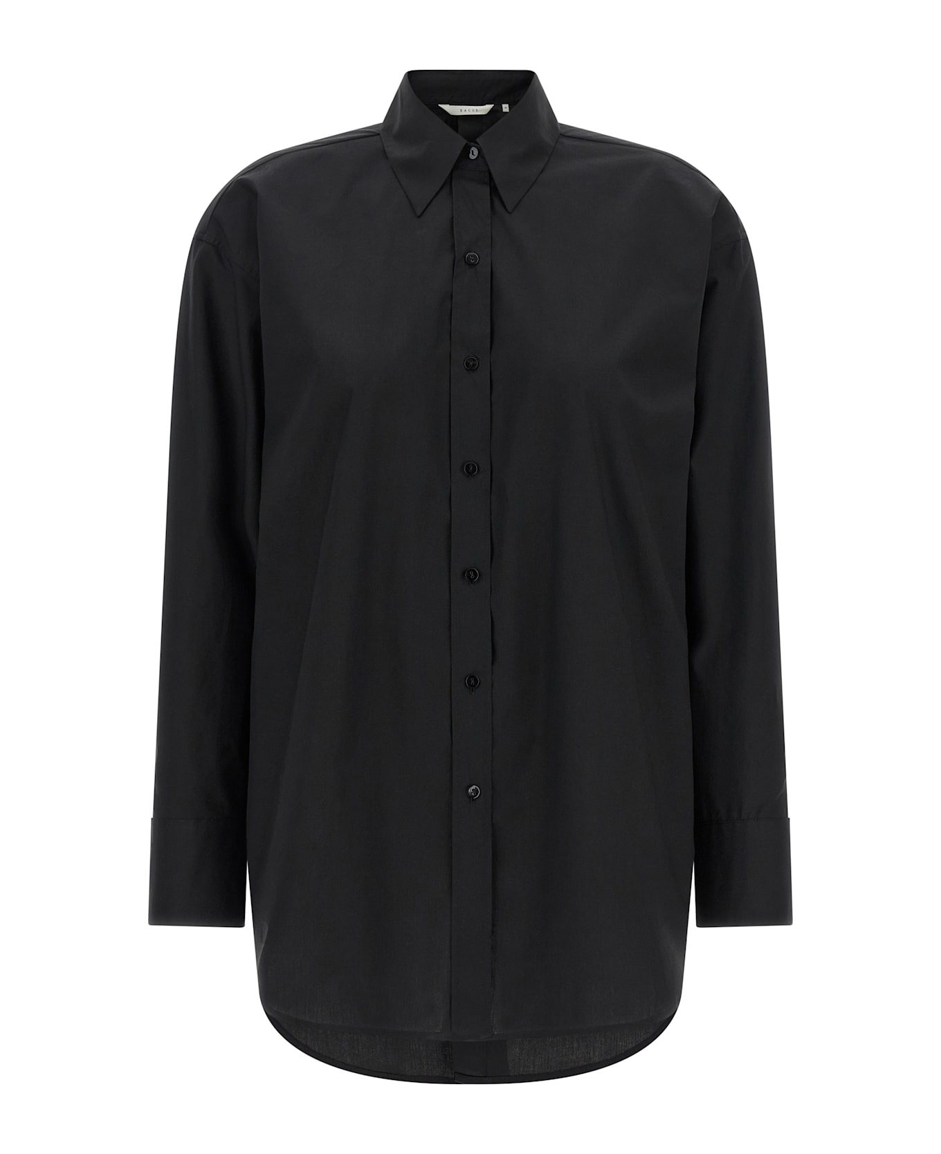 'Scarlet' cotton poplin shirt with button closure at the back and on the sleeves, pointed collar, long sleeves with cuffs and dropped shoulders, rounded hem.