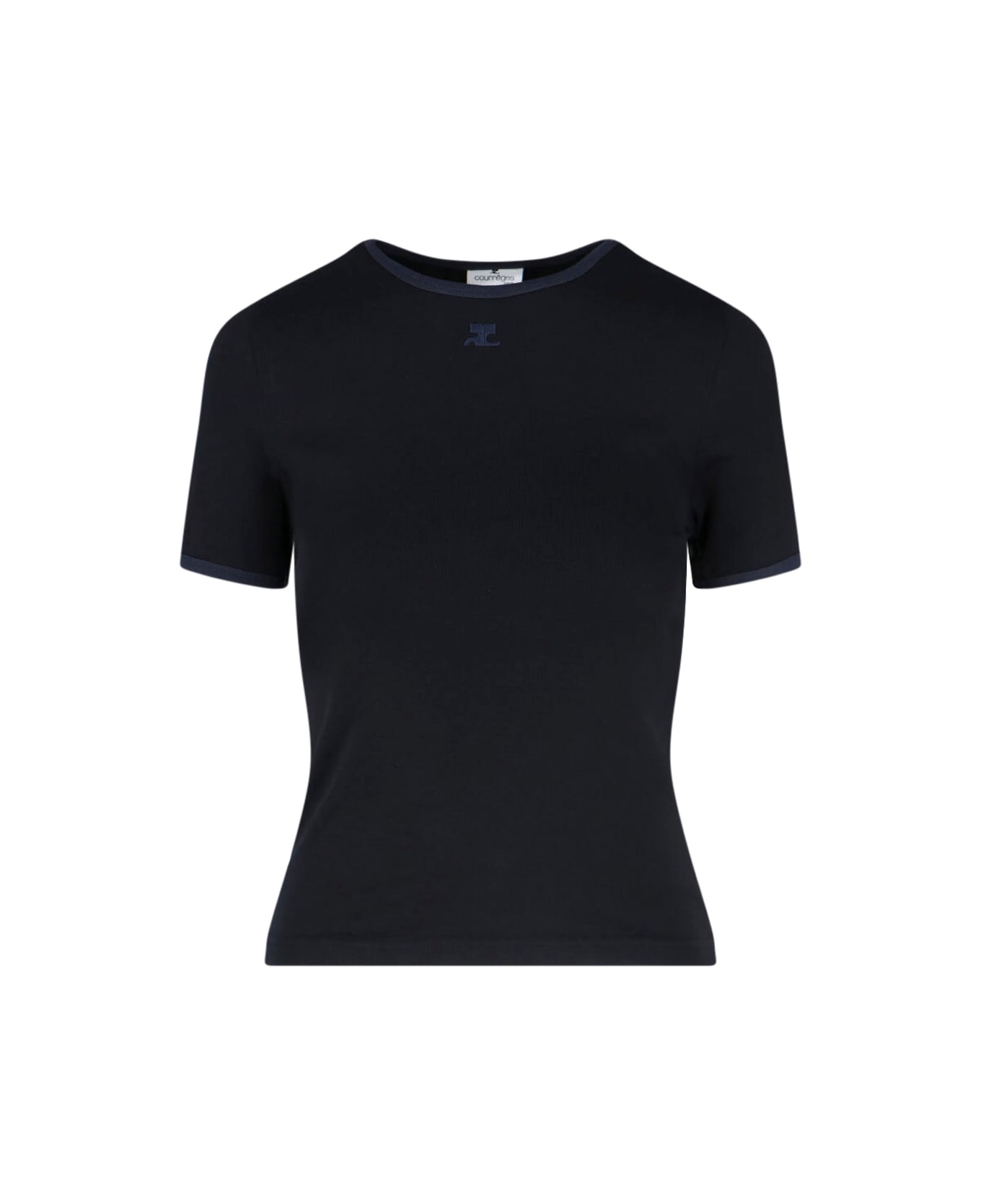 Courrèges logo T-shirt in black cotton with blue trim, ribbed pattern, crew neck, short sleeves, tone-on-tone logo embroidery on the chest, straight hem. Composition: 100% Cotton
