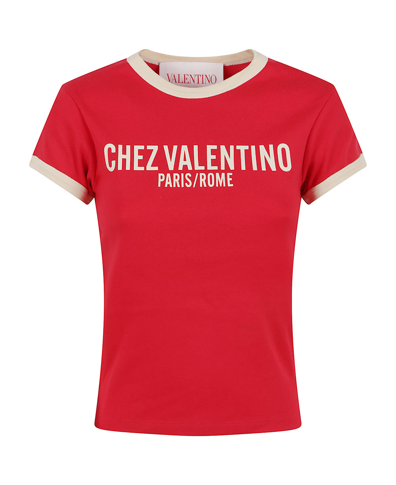 Cotton jersey T-Shirt by VALENTINO GARAVANI. Short sleeve; crew neck; regular fit design that follows the body`s shape. Features Chez Valentino print and contrasting trims.
