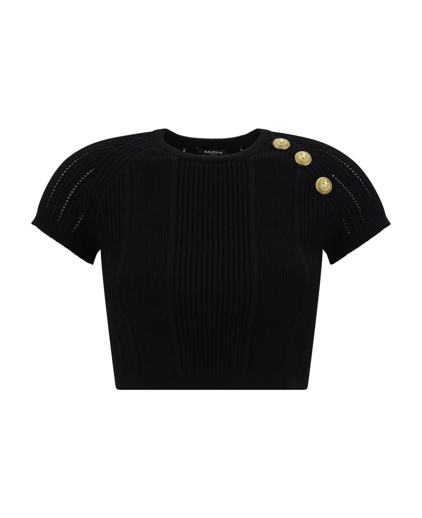 Top by balmain, short sleeve pattern, contrasting applied lion head button detail on front, all-over topstitching detail, cropped pattern, slim fit. Composition: 15% % Polyester, 84% % Viscose