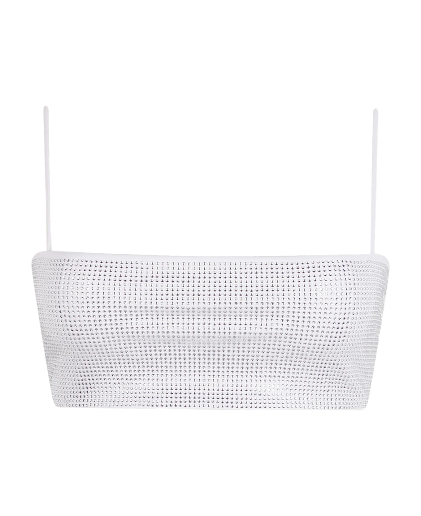 This bandeau top swimsuit is crafted to elevate the wearer's femininity and bring a distinctive, special style to sunny beach days! Bandeau bikini top with thin straps Sparkling rhinestones embellishment White plain color with silver rhinestones Composition: 90% polyamide 10% elastan Model is 176 cm and wears a size small.