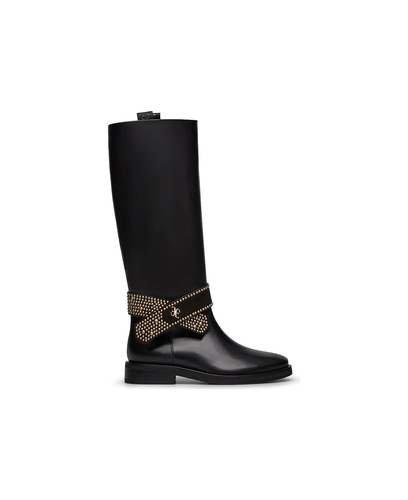 knee-high boot in soft calfskin featuring a strap with the fabi logo and miniature gold studs. rubber sole that provides comfort and flexibility. colour: black material: calfskin