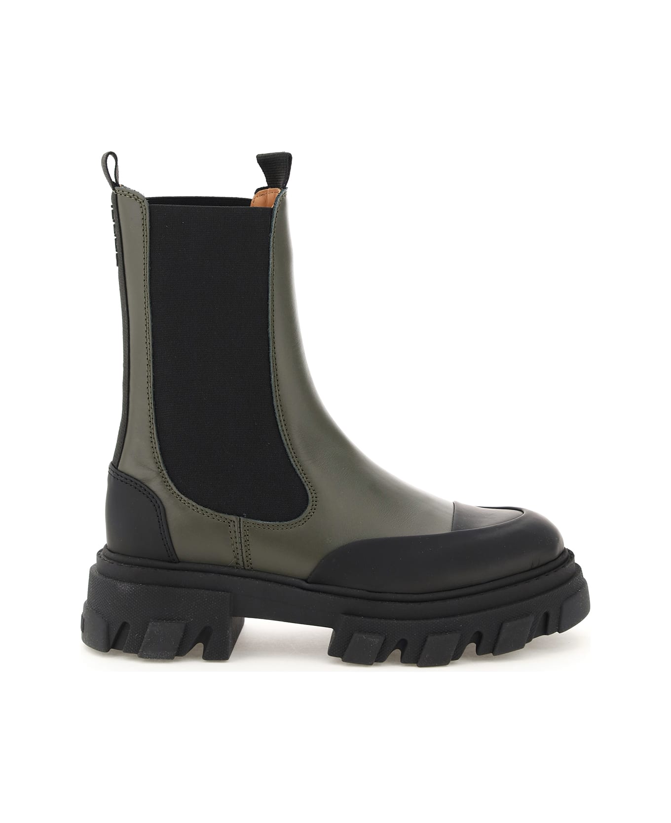 Ganni mid-calf chelsea boots in smooth calf leather with contrasting rubber-coated toe and heel, side elastic inserts and back webbing detail with tone-on-tone rubber logo. Front and back webbing loop, leather interior, rubber lug sole with embossed logo on the back. Composition: 100% LH