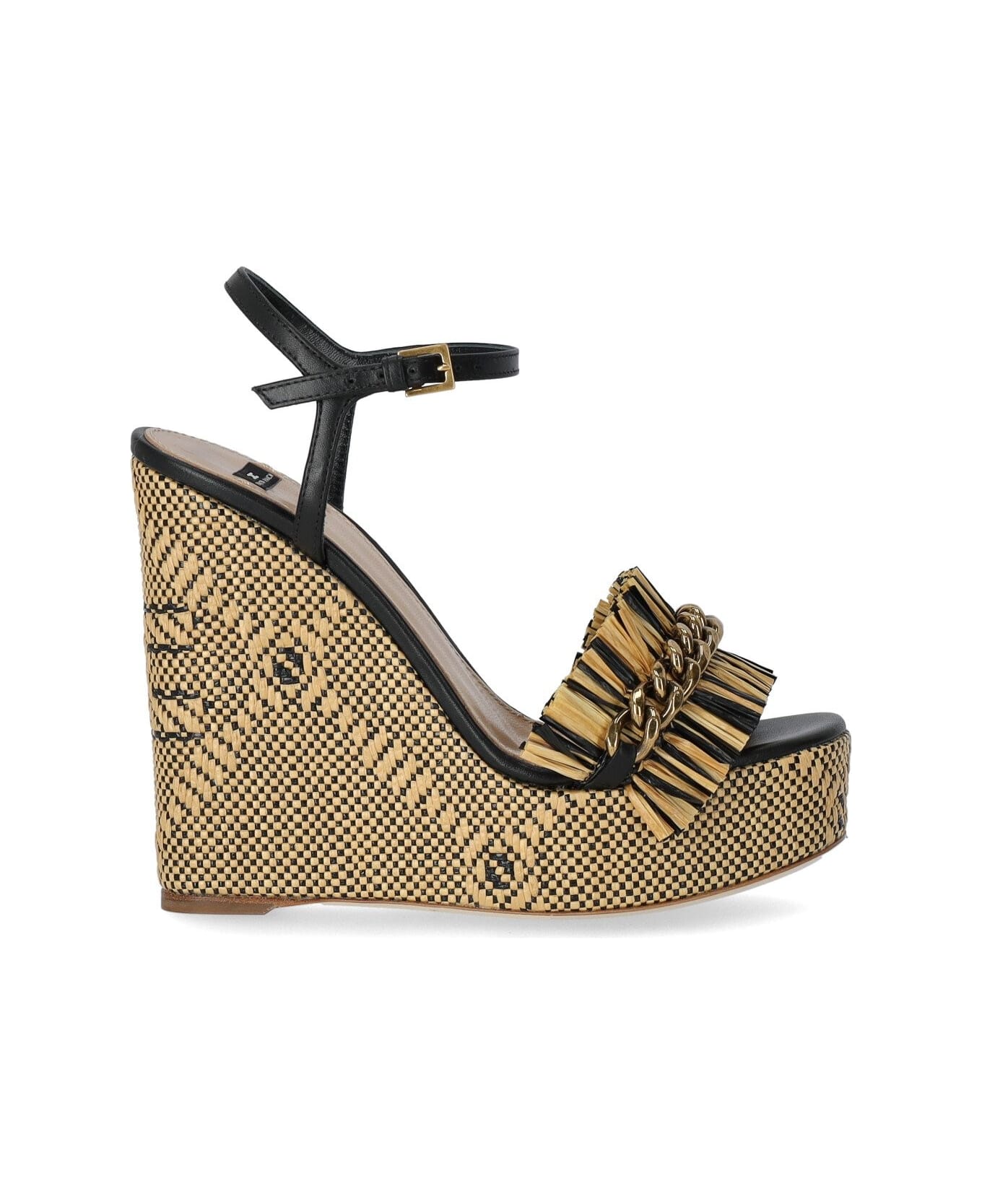 Elisabetta Franchi sandal made of soft black nappa leather with adjustable ankle strap. Raffia band on the front embellished with a golden metal chain, leather insole and wedge with rubber sole. Height 13. 5 cm.