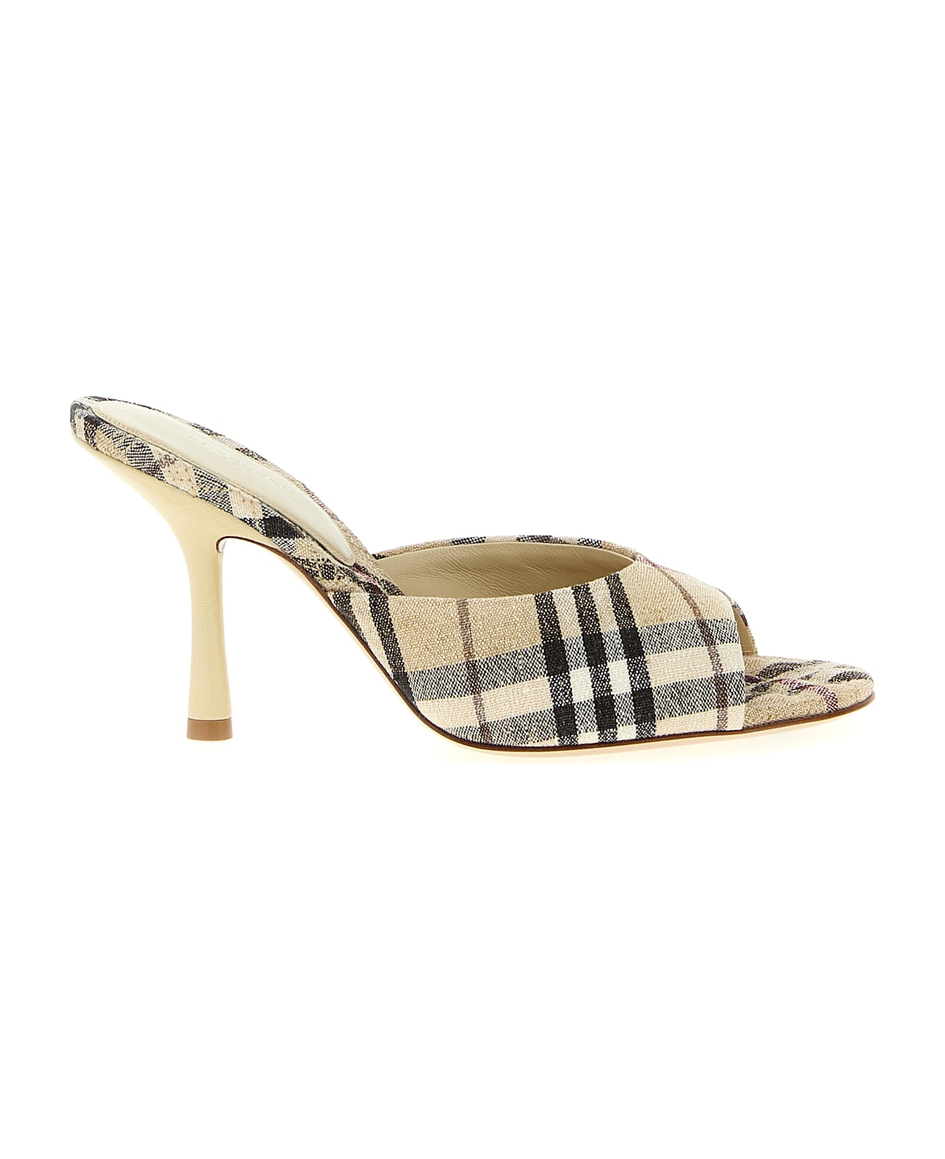 'Mews' linen blend mules woven with Burberry Check, leather stiletto heel, quilted insole with padding, leather sole with embossed 'Equestrian Knight Design'. Composition: 97% linen 3% elastane