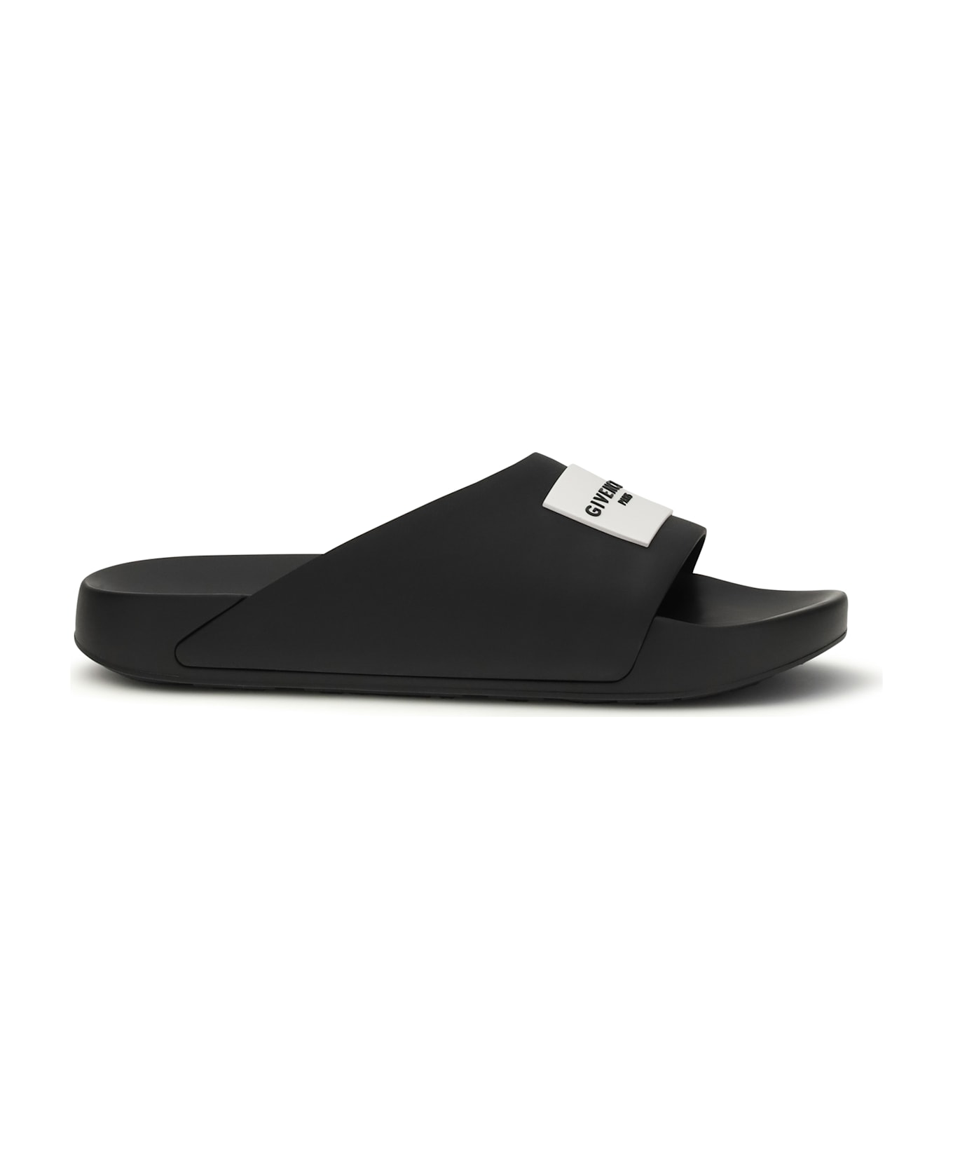 The rubber logo slippers by givenchy offer a modern and bold asymmetrical design. the rubber "givenchy paris" label on the upper and the signature embossed on the inner sole add a touch of understated luxury. the maxi signature under the sole completes the look, adding a distinctive accent. comfortable and stylish, these slippers are perfect for those seeking a blend of practicality and sophistication with every step.