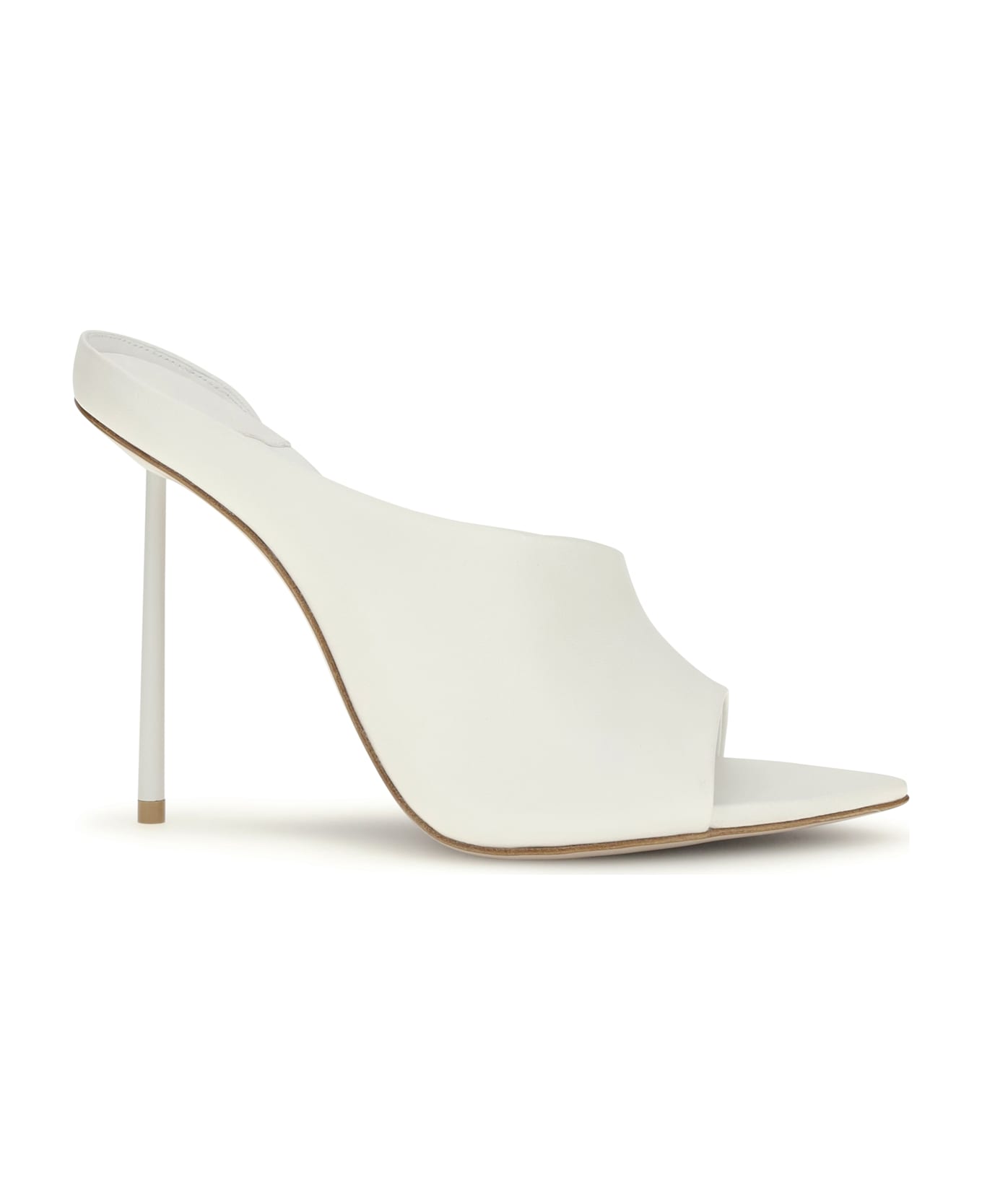 The futura sandals by le silla are essential mules featuring an asymmetrical strap in semi-gloss lambskin. the stiletto heel adds height and rhythm to the silhouette, making these sandals perfect for evening looks that focus on modern elegance. the clean and bright design expresses italian craftsmanship with a contemporary and sophisticated character.