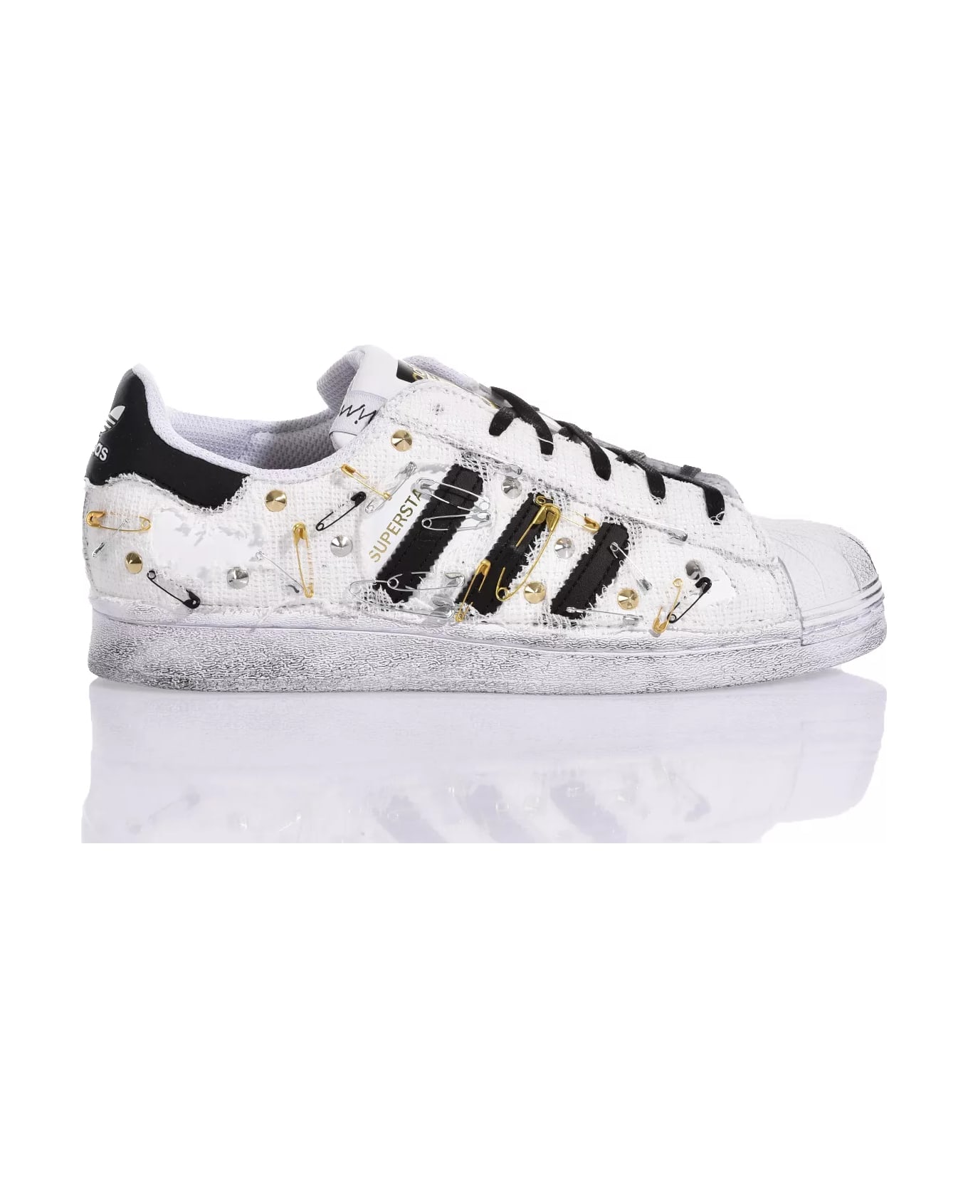 Rebellious and bold are the characteristics of Adidas Superstar Mummy, the custom sneaker for both men and women covered with a mix of gold, silver, and black studs and pins that enhance the rips on the white fuzzy fabric covering the sides of the edgiest sneaker ever. Completing the look is the slight vintage effect in black on the sole, paired with black waxed flat laces. Adidas Superstar Mummy will also come with its original white laces.