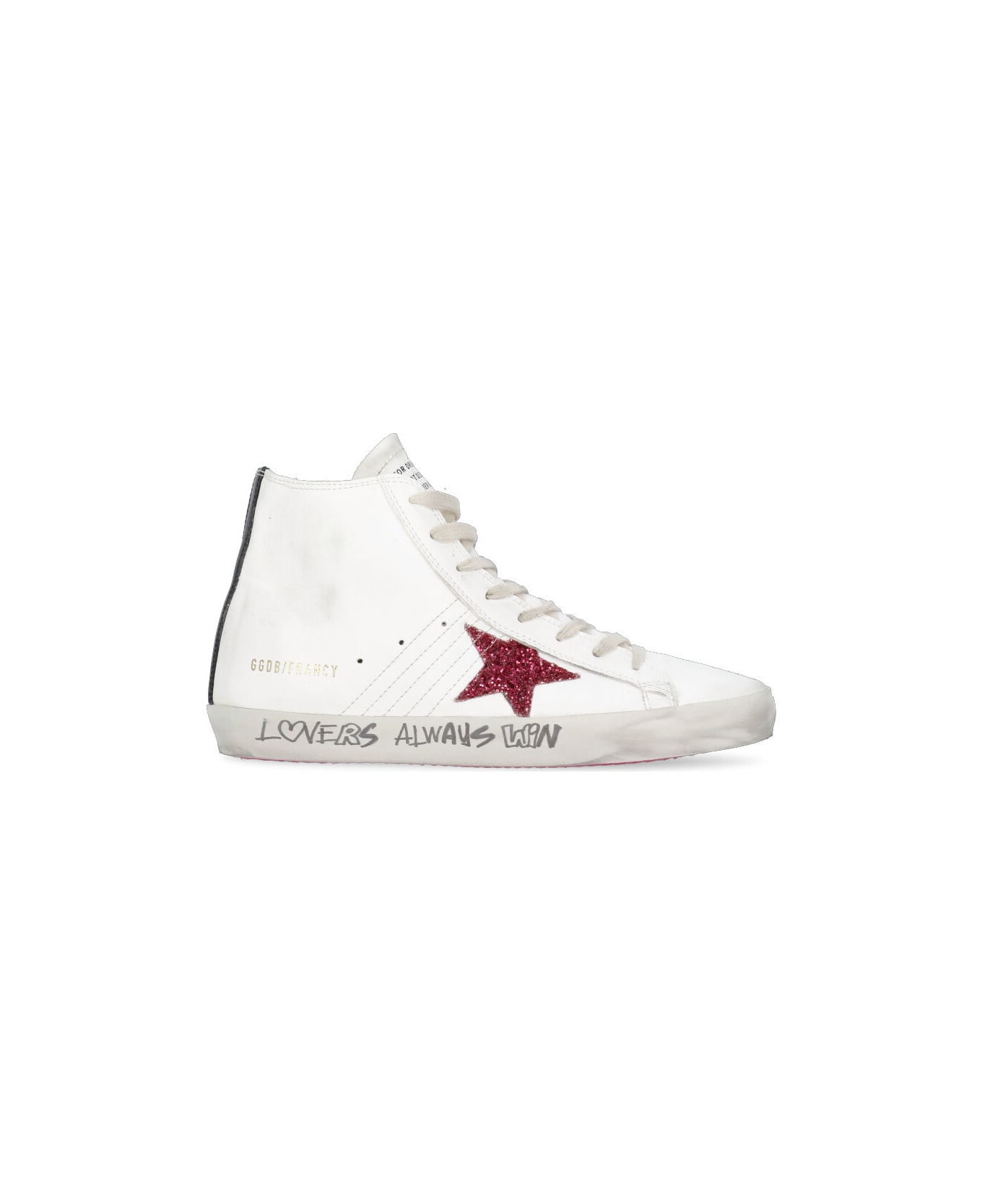 - White Golden Goose smooth leather sneakers for woman - Round toe - Front laces fastening - Side zip fastening - Contrasting color logo at togue - Side glittered iconic Star logo - Side golden logo - Side contrasting color applied logo - Used effect - Rear contrasting color detail - Rubber sole with lettering detail "LOVERS ALWAYS WIN" - Bouclé internal lining