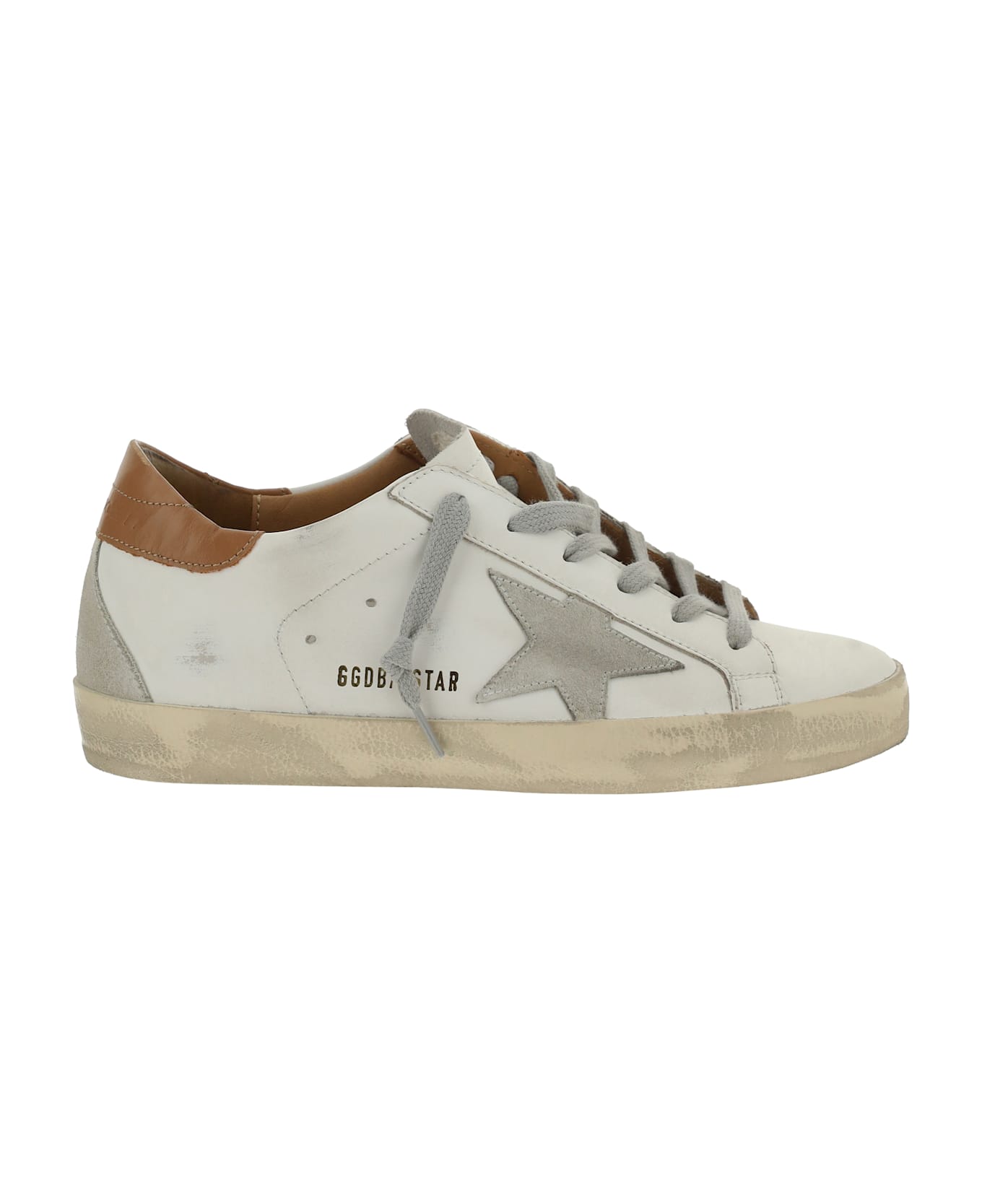 Sneakers by golden goose, iconic star patch at side, contrasting logo at side, round toe, lace-up front, contrasting heel, vintage effect.