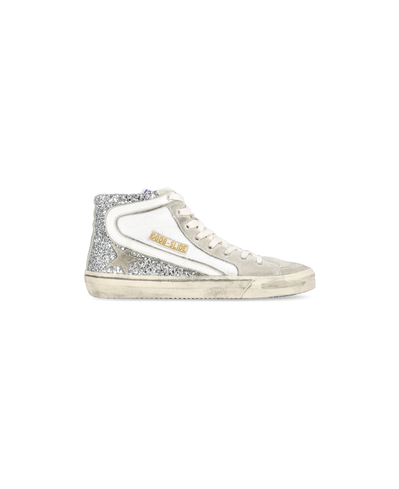 - Multicolor Golden Goose suede leather and tech fabric high top sneakers for woman - Round toe - Front laces fastening - Contrasting color logoed tab at tongue - Side contrasting color logo - Side zip fastening - Glitter inserts - Side iconic Star logo - All-over used effect - Rubber sole