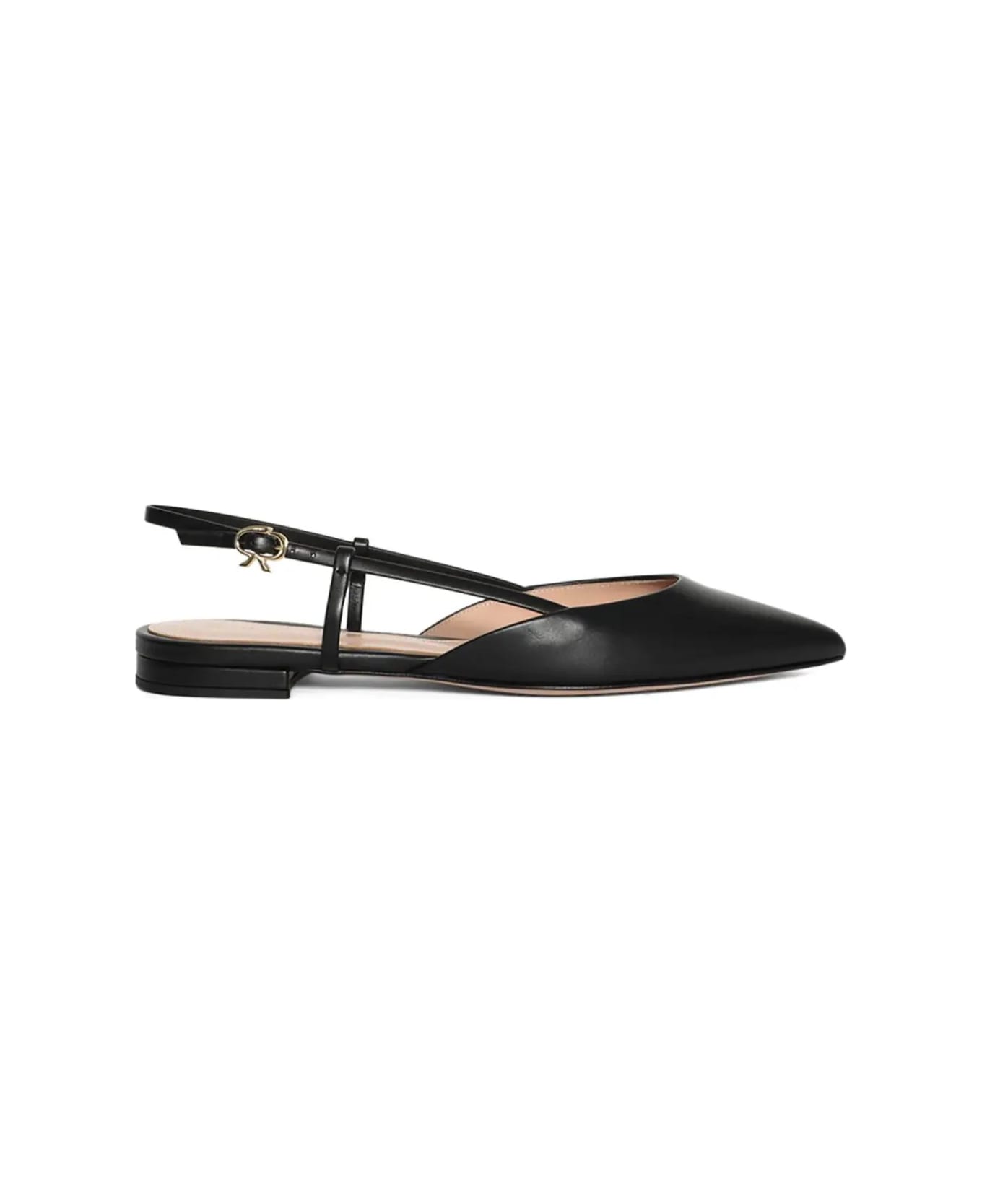 Ascent 05 pointed slingbacks by Gianvito Rossi made from black calfskin leather with a flat sole and a 5 mm low heel. The precious gold metal Ribbon buckle, the brand's signature element, characterises the ankle strap.