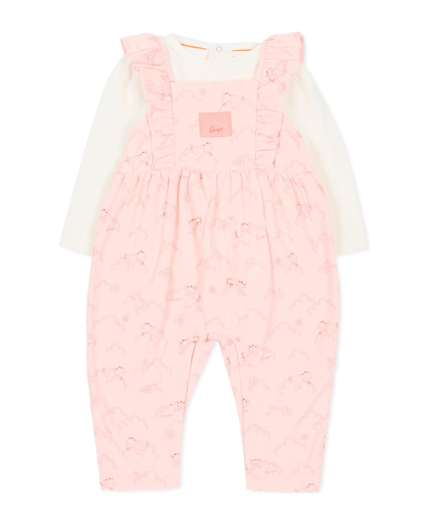 Pink dungarees set composed of overalls and a T-shirt. Corduroy dungarees with shoulder pads, ruffles at the shoulders, and snaps at the back and between the legs; it is embellished with an all-over cat print. Ivory long-sleeved T-shirt with a crew neck and snap closure at the back; it is embellished with a cat print on the chest.